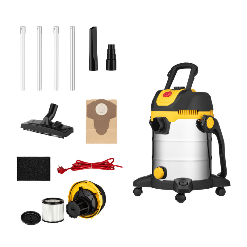 2E PowerClean 20S – професійний пілосос для сухого та вологого прибирання з двигуном 1 200 Вт та баком із нержавіючої сталі ємністю 20 л. Оснащений розеткою для електроінструментів до 2 000 Вт, автоматично синхронізує роботу з ними та ефективно видаляє пил. Завдяки міцній конструкції, багатоступеневій системі фільтрації та набору насадок є найнадійнішим рішенням для майстерень, гаражів та прибирання після ремонту.