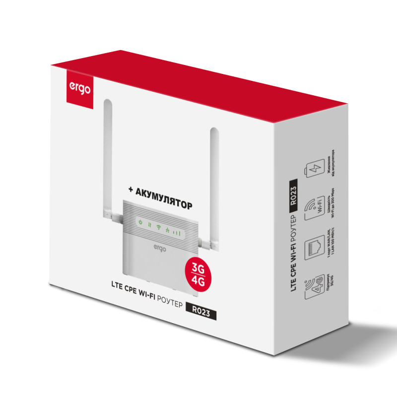 ERGO R023 – це универсальне мережеве пристрій, що забезпечує вихід в Інтернет як через Ethernet, так і через мережі операторів мобільного зв'язку стандартів 3G та 4G.