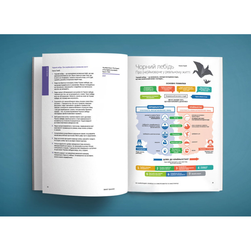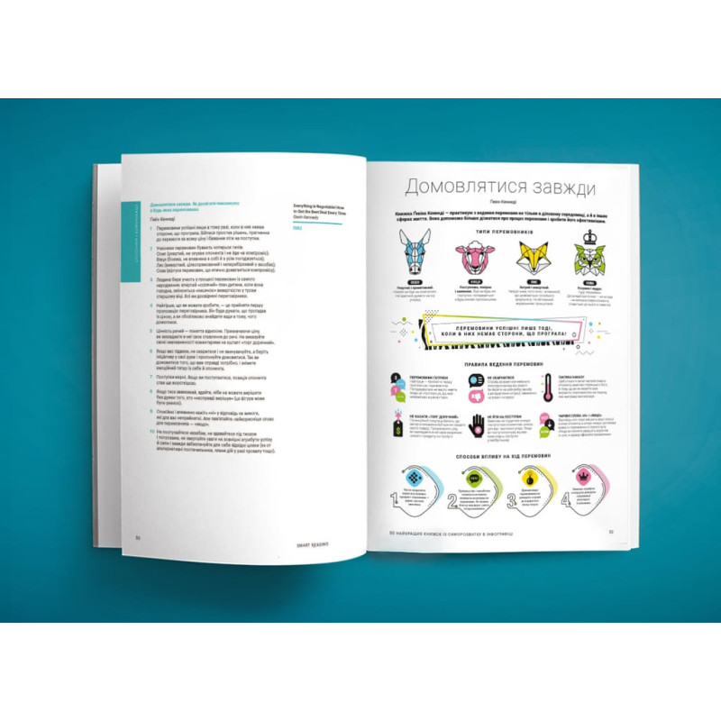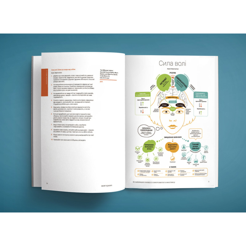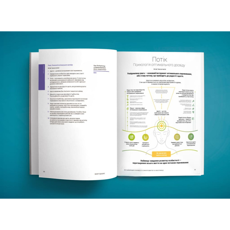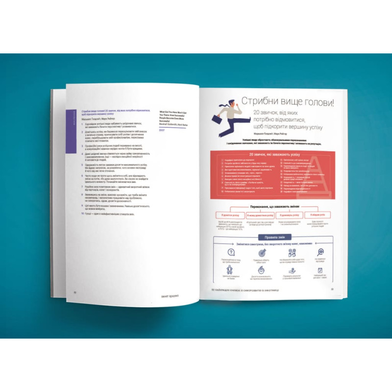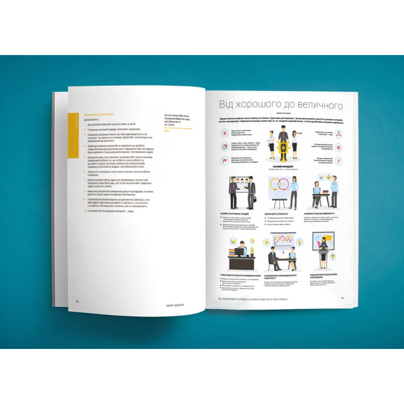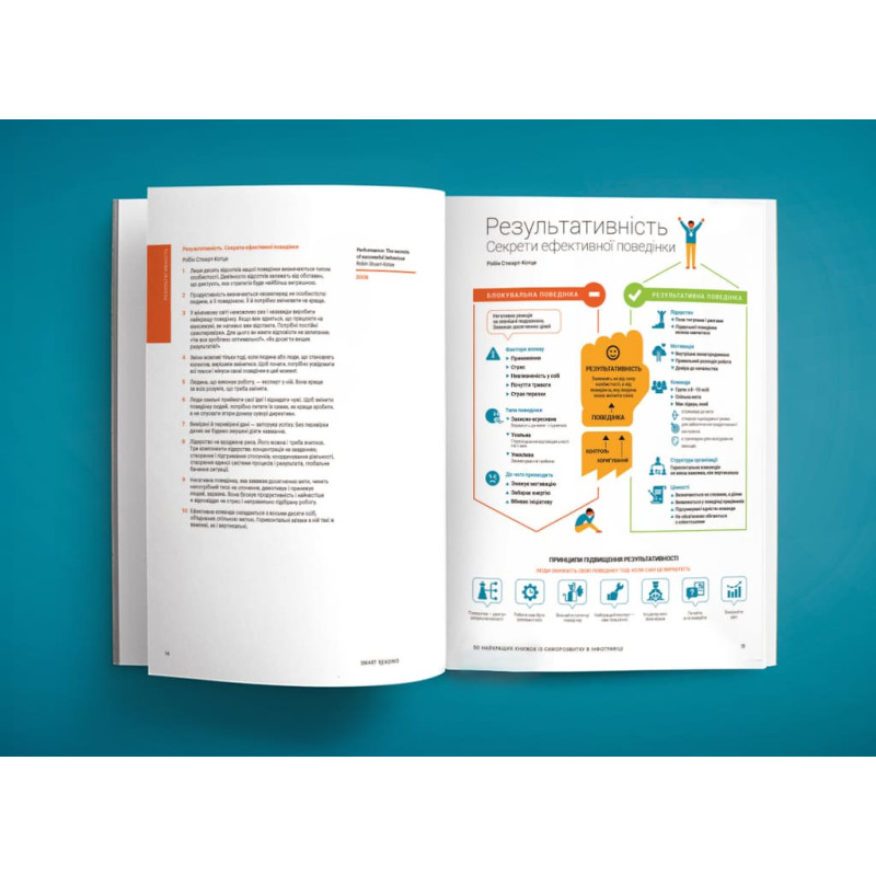 У цьому виданні міститься 50 інфографік, створених на базі найбільш затребуваних книжок-бестселерів, присвячених саморозвитку й особистій ефективності.