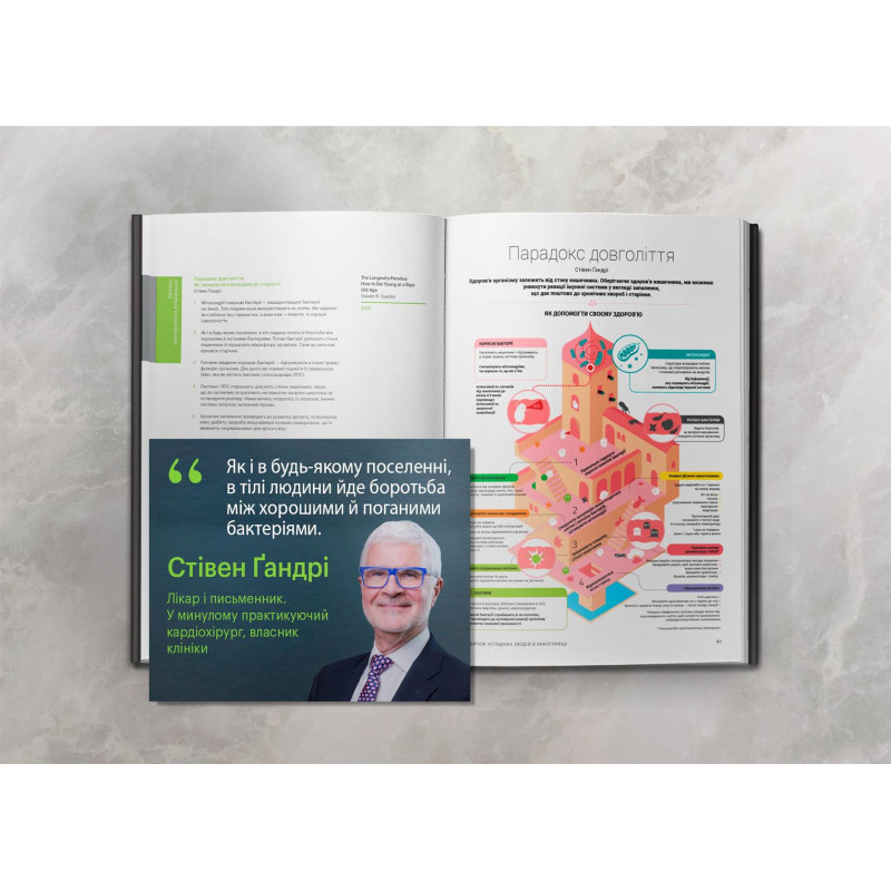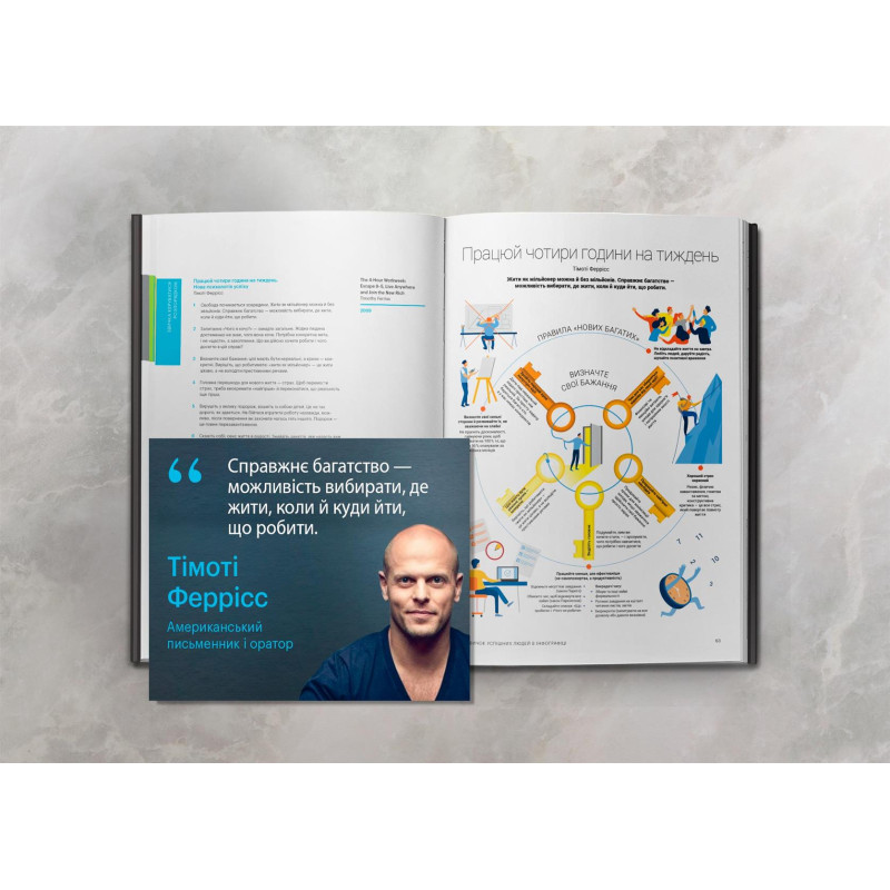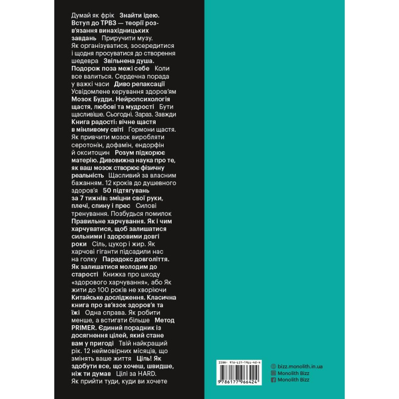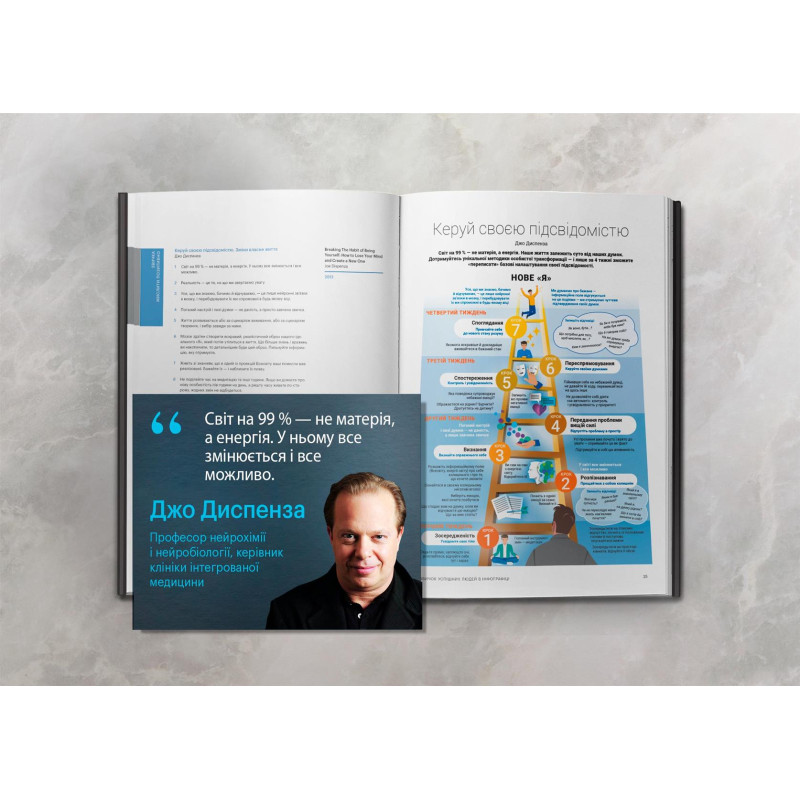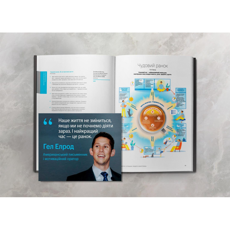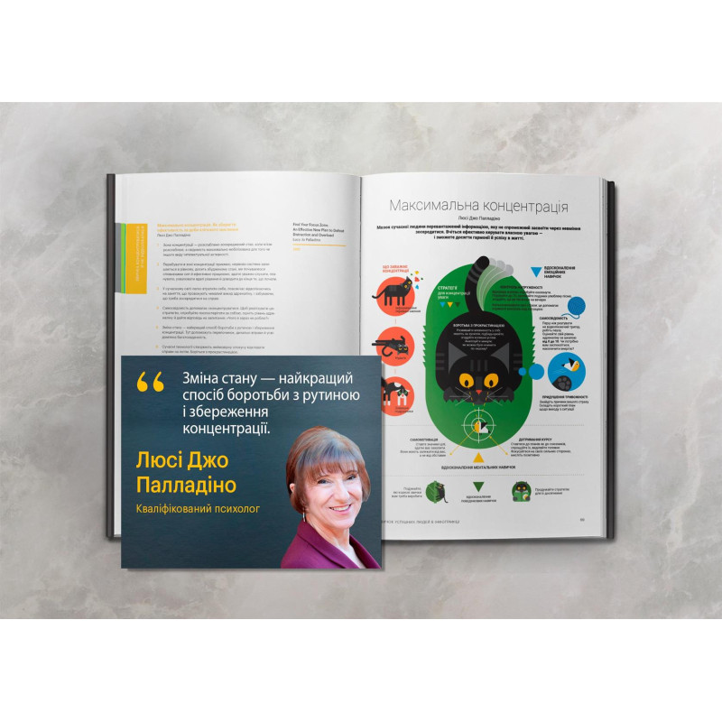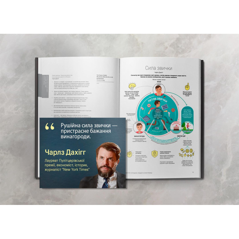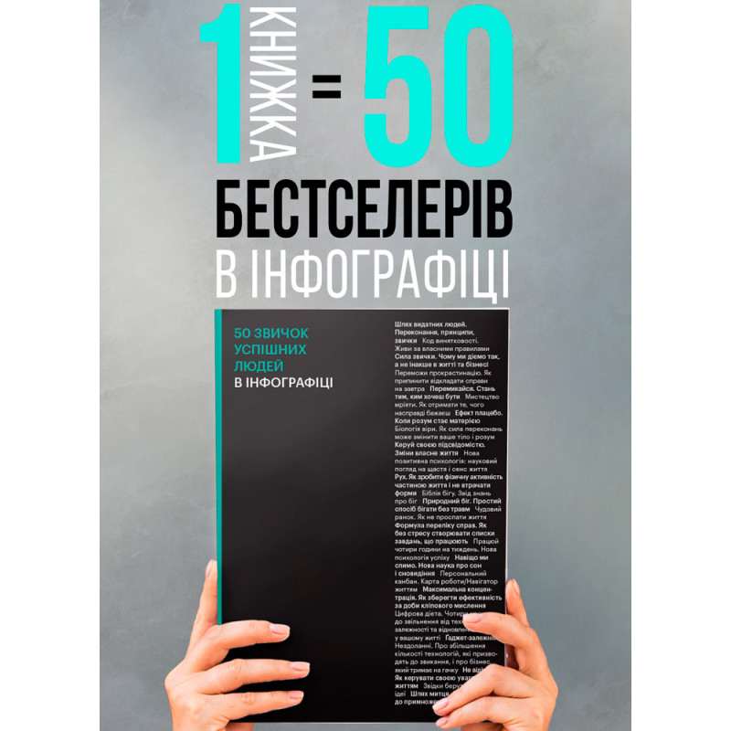 До цього збірника увійшли і були транcформовані у візуальний формат найкращі книжки про корисні звички. Ви знайдете відповіді на запитання, як керувати звичками, як сформувати корисні звички харчування, руху, мислення і стосунків. Інфографіка підтримає вашу цікавість і мотивацію, а 10 ключових ідей з книжки допоможуть не пропустити нічого важливого.