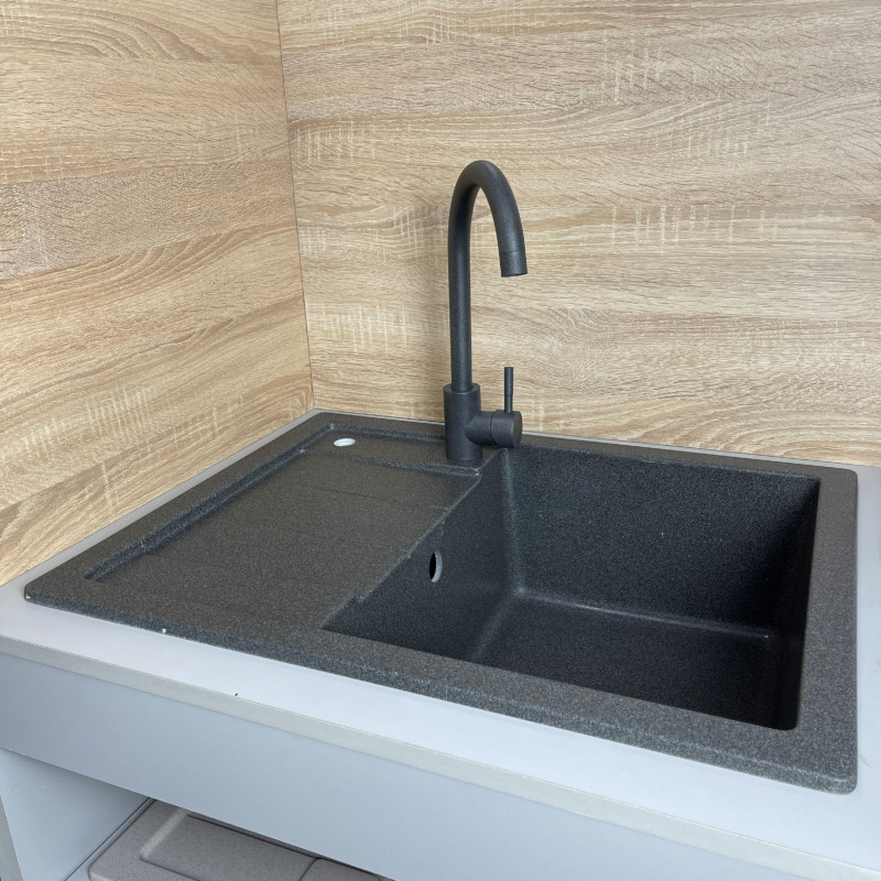 Кухонний набір Adamant Anila поєднує містку мийну зі штучного мінерального матеріалу, змішувач та дозатор миючого засобу. Прямокутна форма з крилом забезпечує зручність у щоденній роботі та дозволяє раціонально організувати робочий простір. Матеріал мийки стійкий до температур, царапин та дії побутової хімії, а непориста поверхня легко очищується. Змішувач виготовлений із безпечних довговічних матеріалів і забезпечує плавне керування водою. Дозатор додає комфорту, позбавляючи від лишніх пляшок на стільниці.