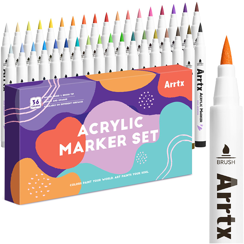 Набір акрилових маркерів Arrtx забезпечує гладке чорнило на водній основі та чудове покриття для різних поверхонь, підходить для паперу, картону, металу, наскального живопису, дерева, пластику, полотна, тканини, каменю, писанок, великодніх прикрас, металу, різдвяних прикрас, розпису гарбуза на Хелловін, каліграфії, скрапбукінгу, написів пензлем, різдвяних листівок, подарунків на день народження, вітальних листівок, або для будь-яких рукодільних проектів "зроби сам" і багато іншого. Проявімо фантазію!
