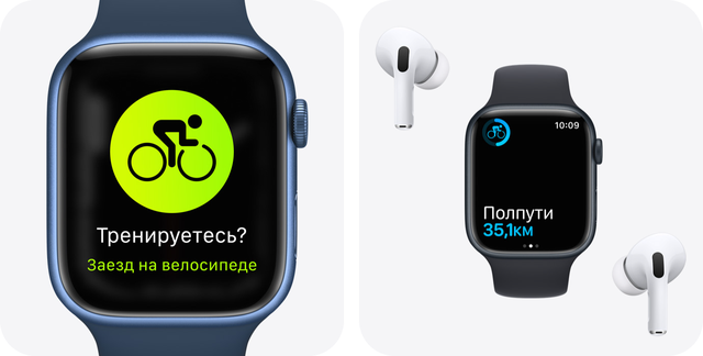 Творці моделі приділили особливу увагу доопрацюванню програми тренувань велосипедистів. Тепер, коли ви зупиняєтеся, розумний годинник Apple Watch Series 7 більше не включає цей час в тренування. При цьому, коли педалі знову крутяться – відлік буде продовжений. Виявлення падіння запобігає екстреним випадкам, дозволяючи викликати допомогу в серйозній ситуації. Аудіовідгуки дозволять контролювати всі найважливіші показники вашої ефективності, не відволікаючись на екран.