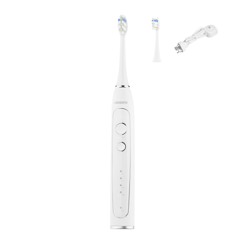 Електрична зубна щітка ARDESTO ETB-113W зі звуковою технологією чищення та середньою жорсткістю щетини DuPont. Набагато краще видаляє, ніж звичайні щітки, зубний наліт і камінь. Має чотири режими роботи: стандартне чищення, для чутливих зубів, відбілювання та масаж ясен.