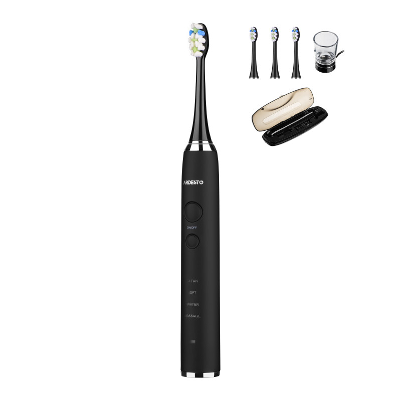 Електрична зубна щітка ARDESTO ETB-212СB зі звуковою технологією чищення та середньою жорсткістю щетини DuPont. Набагато краще видаляє зубний наліт і камінь, ніж звичайна щітка. Має чотири режими роботи: стандартне чищення, для чутливих зубів, відбілювання, масаж ясен.