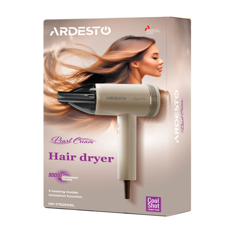 Фен ARDESTO Pearl Cream HD-Y702PERL елегантного бежевого кольору поєднує функціональність, стильний дизайн та зручність щодо використання. Пристрій потужністю 1 500–1 800 Вт оснащений високопродуктивним BLDC двигуном, який обертається зі швидкістю до 90 000 об/хв, створюючи потужний потік повітря. Це дає змогу швидко висушити навіть густе волосся без перегрівання. Фен має насадку-концентратор та дифузор. Насадка-концентратор спрямовує потік повітря від коренів до кінчиків волосся для надання гладкості. Дифузор допомагає зберегти природну текстуру волосся. Передбачено 2 швидкісних та 3 температурних режими. Фен має функцію іонізації, яка зменшує статичне електрику. Зафіксувати зачіску допоможе функція Cool Shot.
