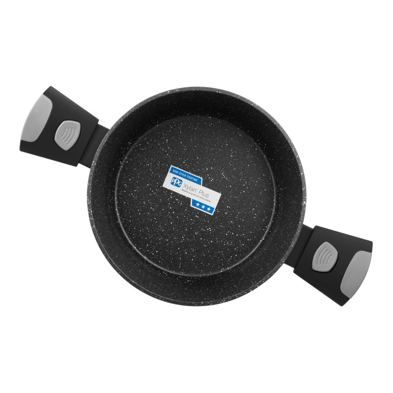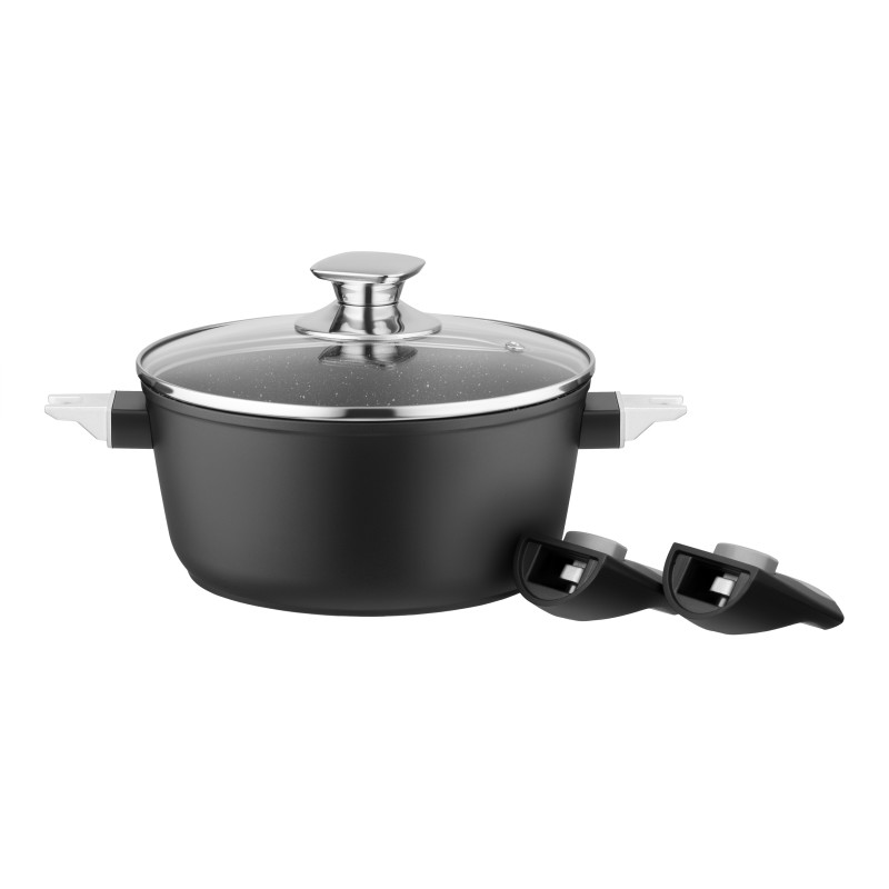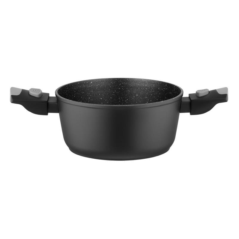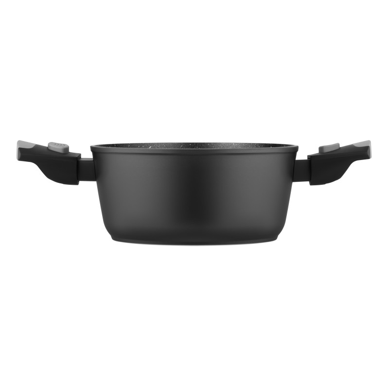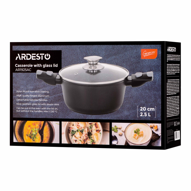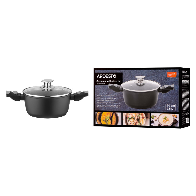Кастрюля Gemini Bari глибокого чорного кольору є компактною та функціональною. Об'єм 2,5 л, діаметр 20 см, товсте дно (4 мм) та стінки (2,6 мм) забезпечують стабільне нагрівання, а двокульове мраморове покриття Xylan Plus зменшує ризик пригорання. Матеріал виготовлення – кований алюміній, який витримує інтенсивне використання. Бакелітове руків'я можна легко зняти перед запіканням у духовці (до 220 °C), а термостійка скляна кришка з відвіром для парі дає змогу контролювати процес без втрати тепла. Кастрюлю можна використовувати зі всіма типами плит – від газових до індукційних. Виріб легко очищувати в посудомийній машині, а тому він є зручним для щоденного використання без лишніх обмежень.