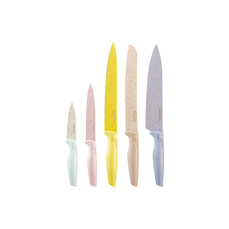 Щоб приготування смачних страв дарувало задоволення, необхідно мати під рукою зручні та якісні кухонні приладдя, незмінною складовою якого є ножі. Добре, якщо їх кілька, як у наборі ARDESTO Fresh, який, крім іншого, дарує естетичне задоволення, бо містить: кухарський ніж (20,3 см) рожевого кольору, ніж для хліба (20,3 см) бежевого кольору, ніж слайсерний (28,3 та см) блакитного кольору.