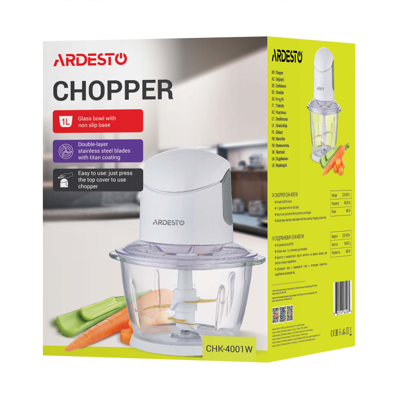 Компактний чоппер білого кольору для швидкого подрібнення інгредієнтів та приготування різноманітних соусів. У комплектацію входить скляна чаша та подвійні ножі.
