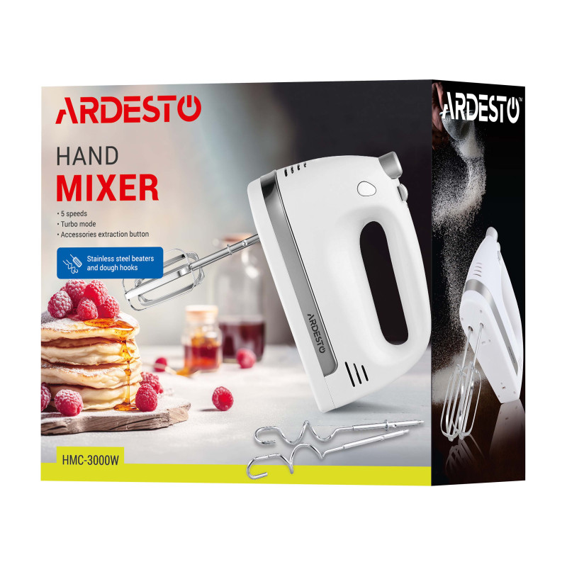 Ручний міксер ARDESTO HMC-3000W з двигуном з мідною обмоткою у корпусі білого кольору. Потужність пристрою становить 300 Вт. Міксер має компактний розмір, завдяки чому поміститься в кухонному ящику чи шафі.