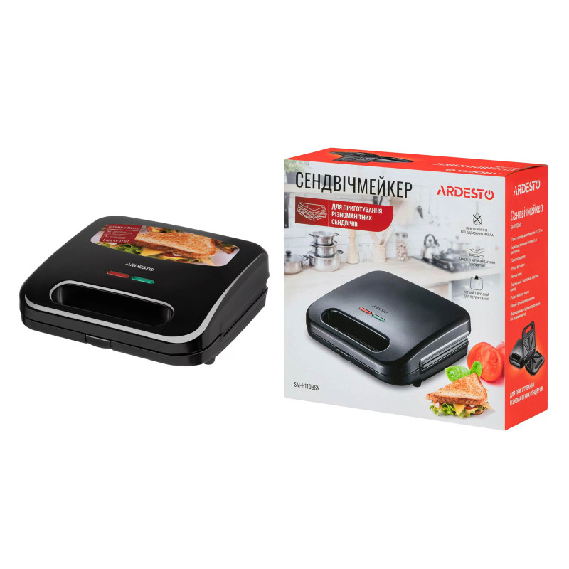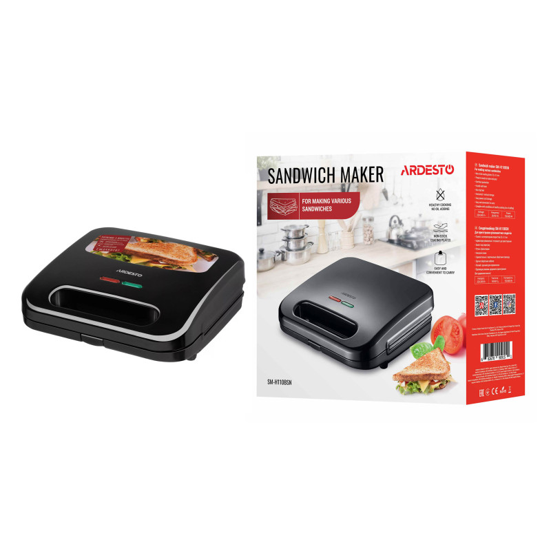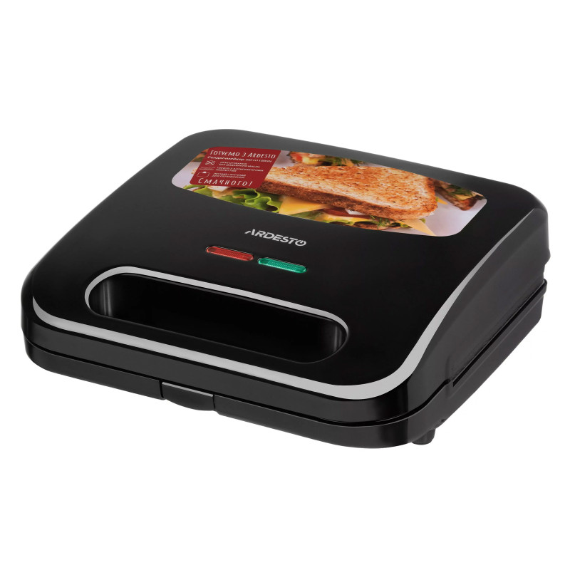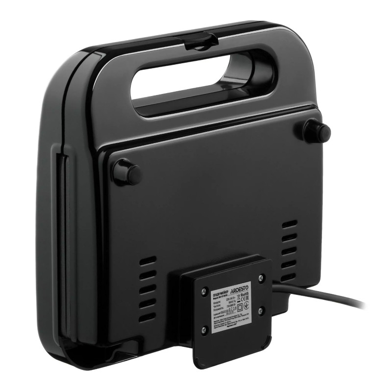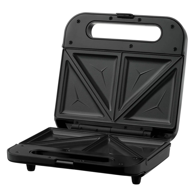 Сендвічмейкер чорного кольору з потужністю 700 Вт та двома пластинами для приготування різноманітних сендвічів.