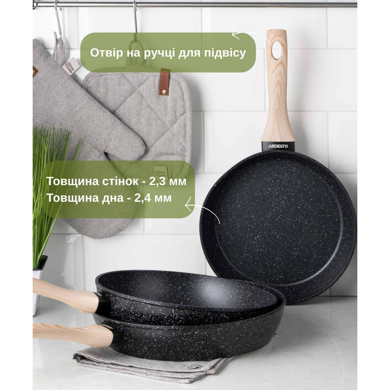 Сковорода ARDESTO Midori виготовлена з якісного алюмінію, завдяки чому забезпечується рівномірний розподіл тепла. Її діаметр становить 26 см за товщини стінок 2,3 мм. Сковорода має протипригарне мармурове покриття, що зумовлює можливість приготування страв із використанням мінімальної кількості олії.
