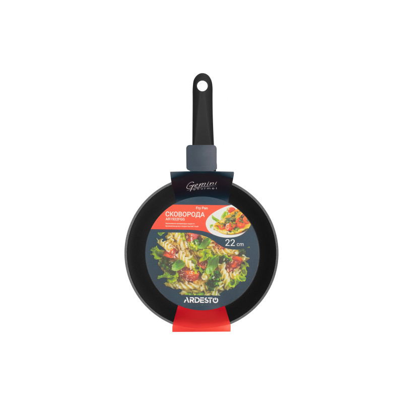 Алюмінієва сковорода чорного кольору з антипригарним покриттям та термостійкою ергономічною ручкою. Сковорода Gemini Gourmet сумісна з усіма видами плит – газовими, електричними, галогенними, склокерамічними та індукційними.