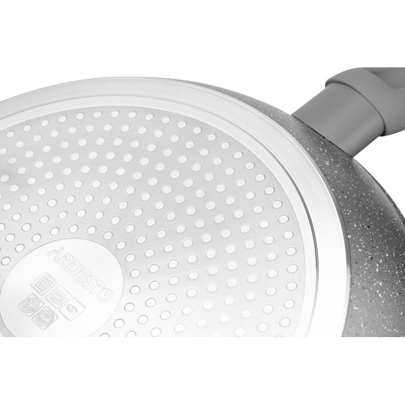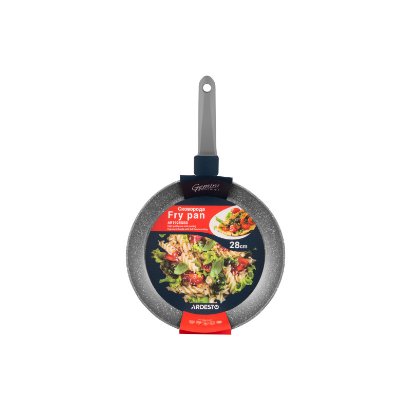 Сковорода виготовлена з кованого алюмінію, її діаметр складає 28 см. На внутрішній поверхні Gemini Gourmet Vasto має тришарове протипригарне покриття PFLUON. За висоти 5 см товщина бічних стінок становить 2,2/4 мм, а дна – 2,3 мм. Зручність під час приготування забезпечує бакелітове руків’я із soft-touch-покриттям.