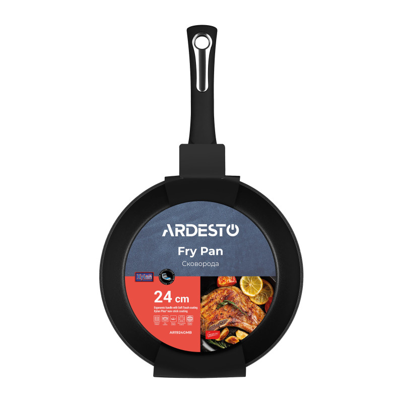 Алюмінієва сковорода чорного кольору з багатошаровим антипригарним покриттям Xylan Plus® та термостійкою бакелітовою ручкою. Сковорода Gemini сумісна з усіма видами плит.