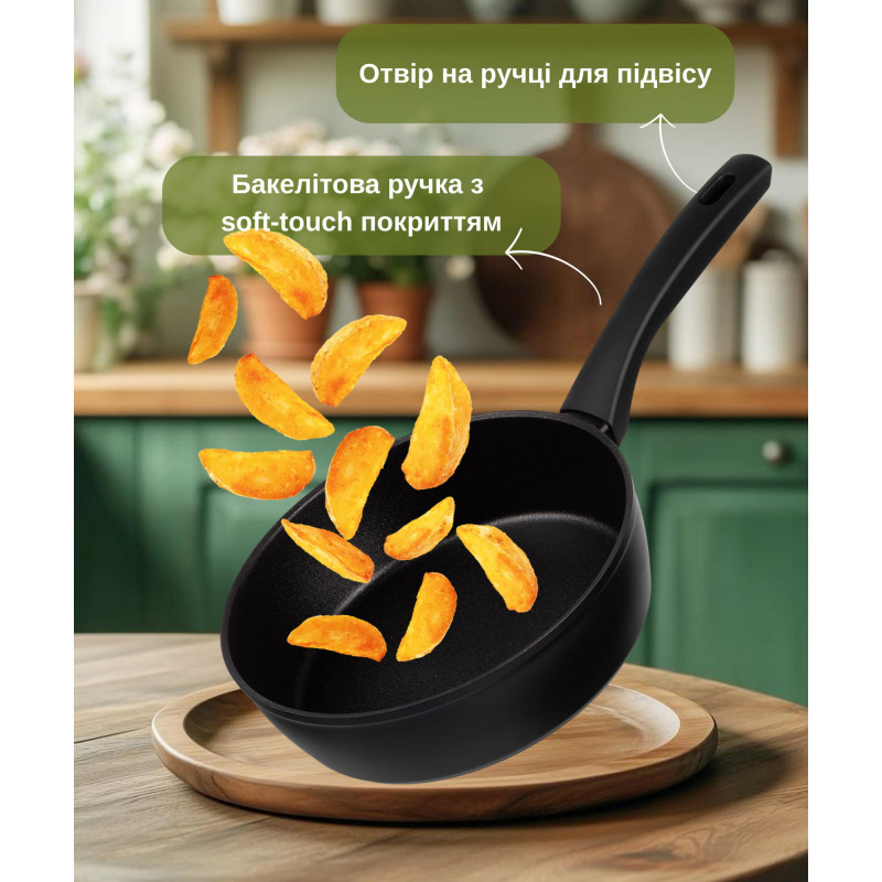 Глибока сковорода ARDESTO Black Mars вирізняється якістю корпусу з кованого алюмінію та протипригарним покриттям Megastone (3 шари). Матеріал виготовлення стійкий до деформації, не окислюється, не іржавіє не змінює смаку страв. Завдяки гарній теплопровідності та рівномірному розподілу тепла економить час приготування. Діаметр виробу чорного кольору 28 см. Ергономічне бакелітове руків’я з покриттям SOFT TOUCH не вислизне з рук і не спричинить втоми. Готувати можна на газових, електричних, склокерамічних, галогенних та індукційних плитах. Догляд не передбачає миття в посудомийній машині.
