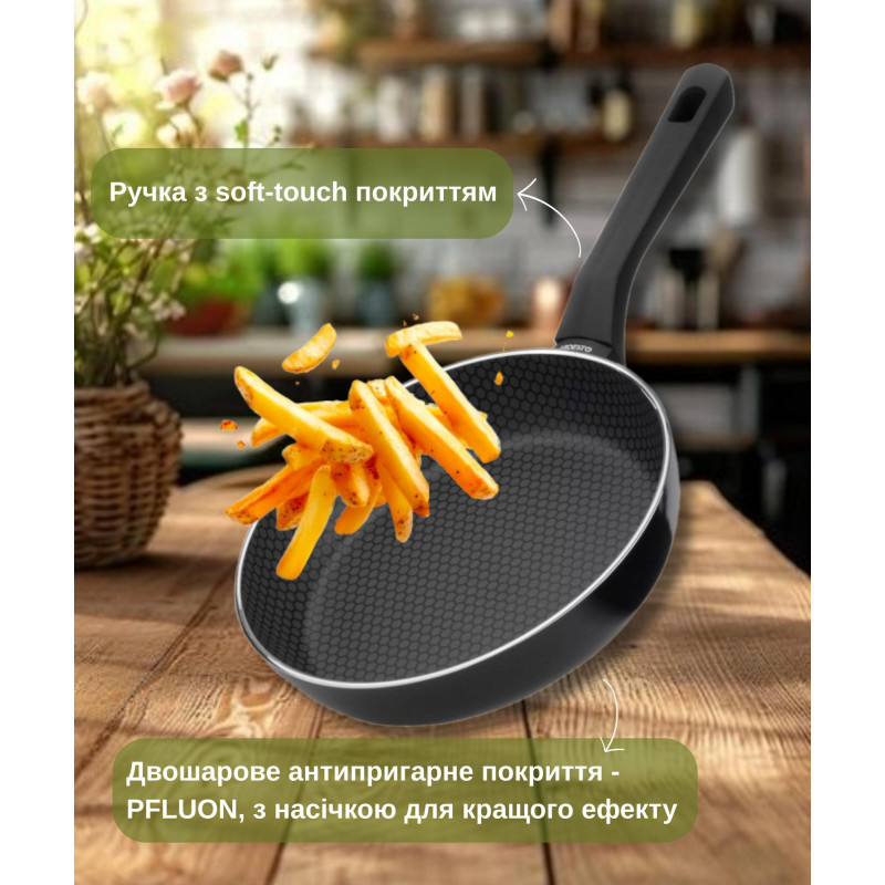 Глибоку сковороду ARDESTO Gemini діаметром 28 см виготовлено з кованого алюмінію, який забезпечує швидке та рівномірне нагрівання. Сковороду вкрито двома шарами протипригарного покриття PPG XYLAN PLUS, тож під час приготування можна використовувати менше олії та дотримуватися здорового харчування.