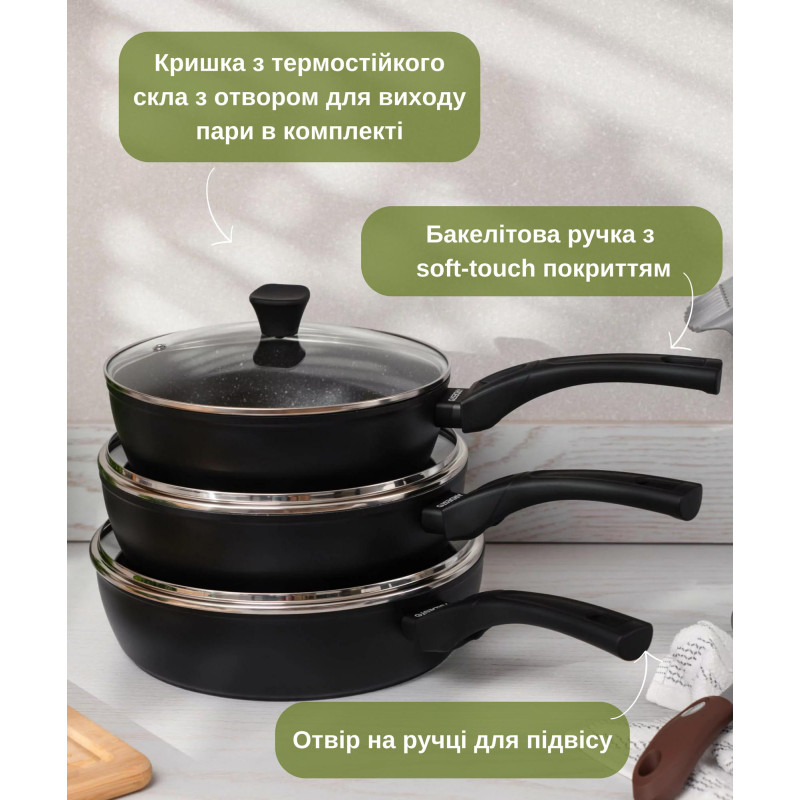 | Особливості сковороди | Ручки із системою soft touch, рекомендовано мити вручну |