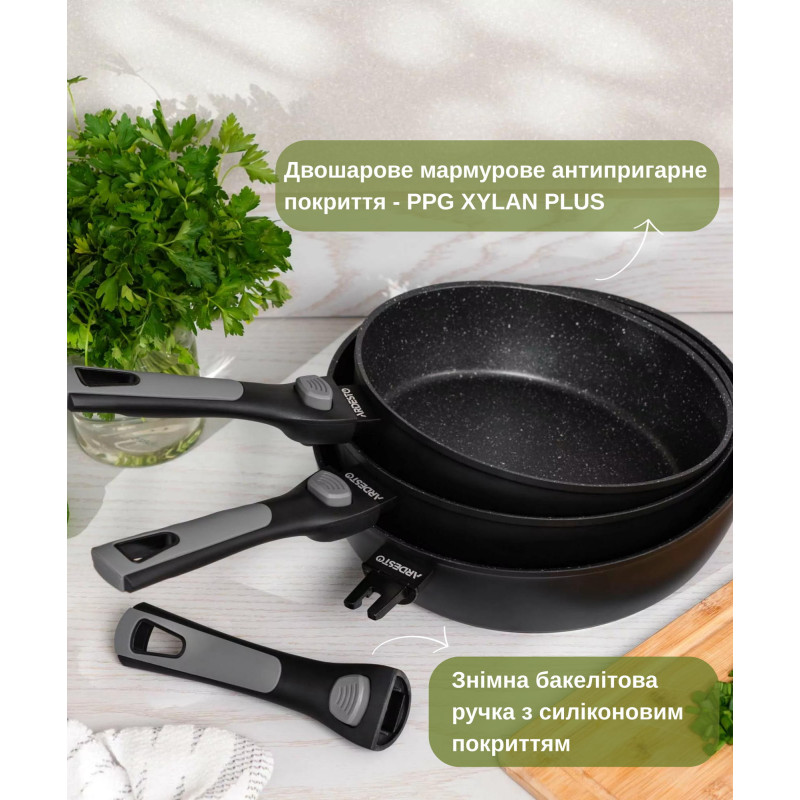 | Особливості сковороди | зйомна ручка, рекомендовано миті вручну |
