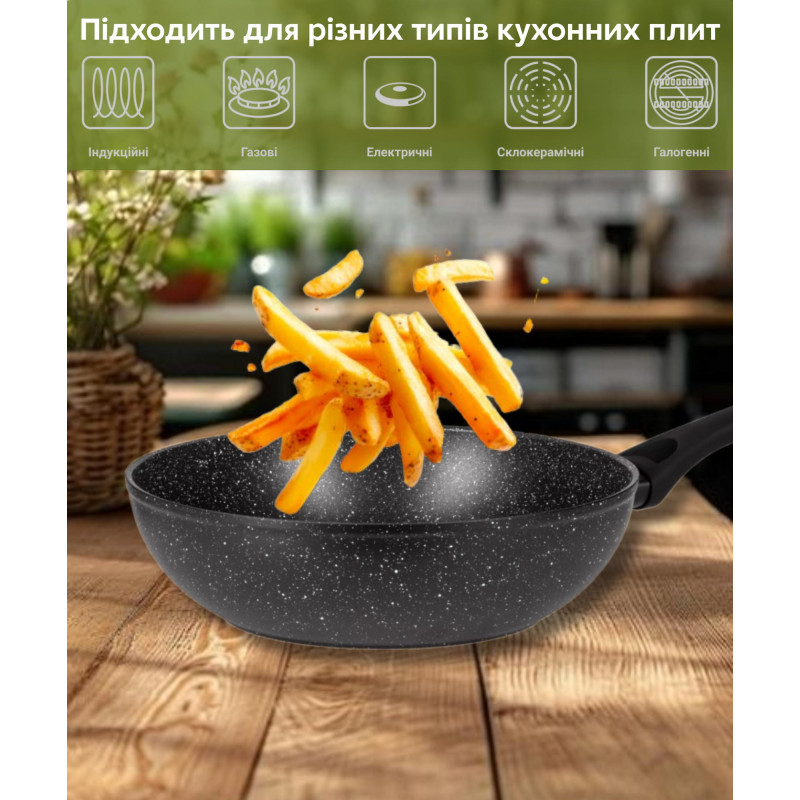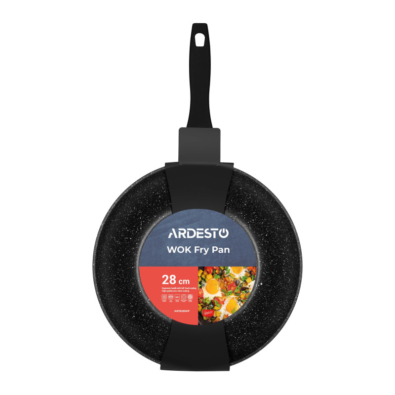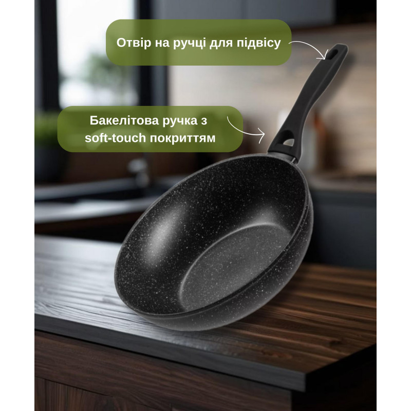 Сковорода WOK серії Gemini Gourmet Anzio виготовлена з кованого алюмінію у чорному кольорі. У серії посуду Gemini Gourmet використовується мармурове антипригарне покриття. Ручка виготовлена з бакеліта з Soft-touch покриттям. Сковорода сумісна з усіма видами плит, включаючи індукційну.