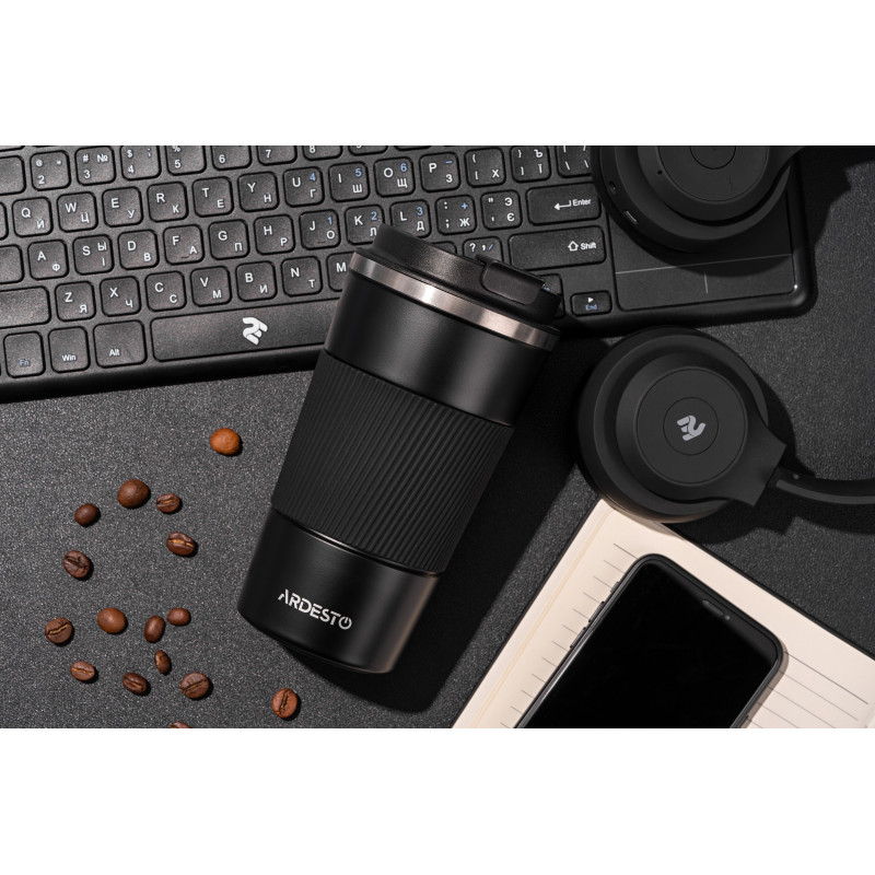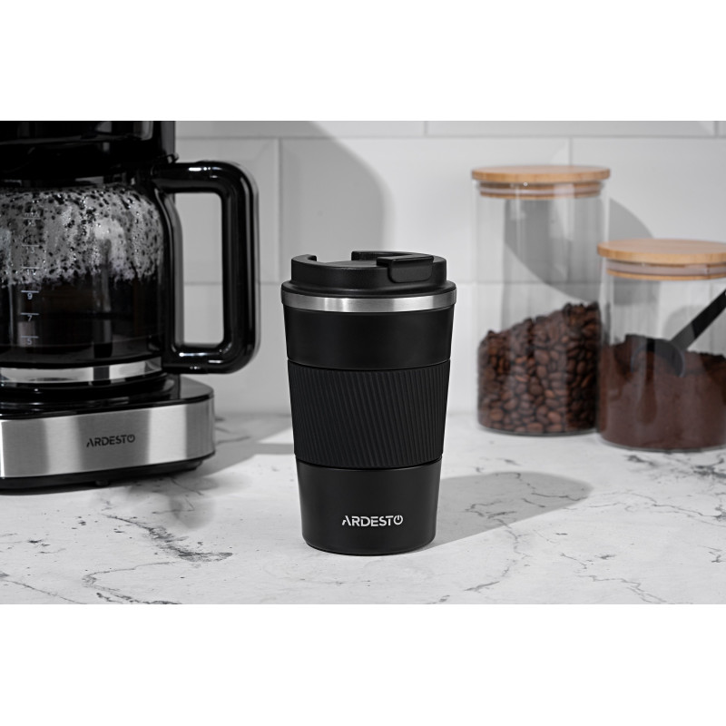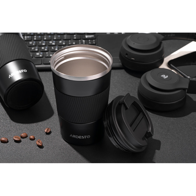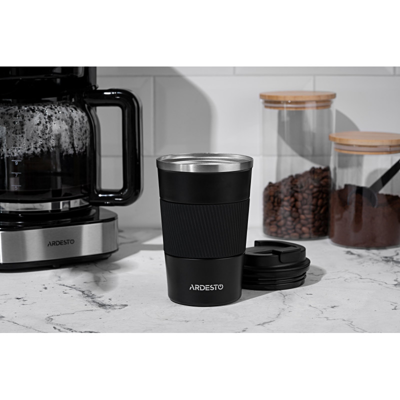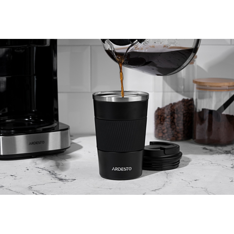 Чорний термокухоль із нержавіючої сталі (18/10) заввишки 14.5 см і має об’єм 380 мл. Здатний зберігати температуру гарячого напою протягом 12 годин, а холодного – протягом 24 годин. Не містить бісфенол А (BPA). Не рекомендовано мити в посудомийній машині.