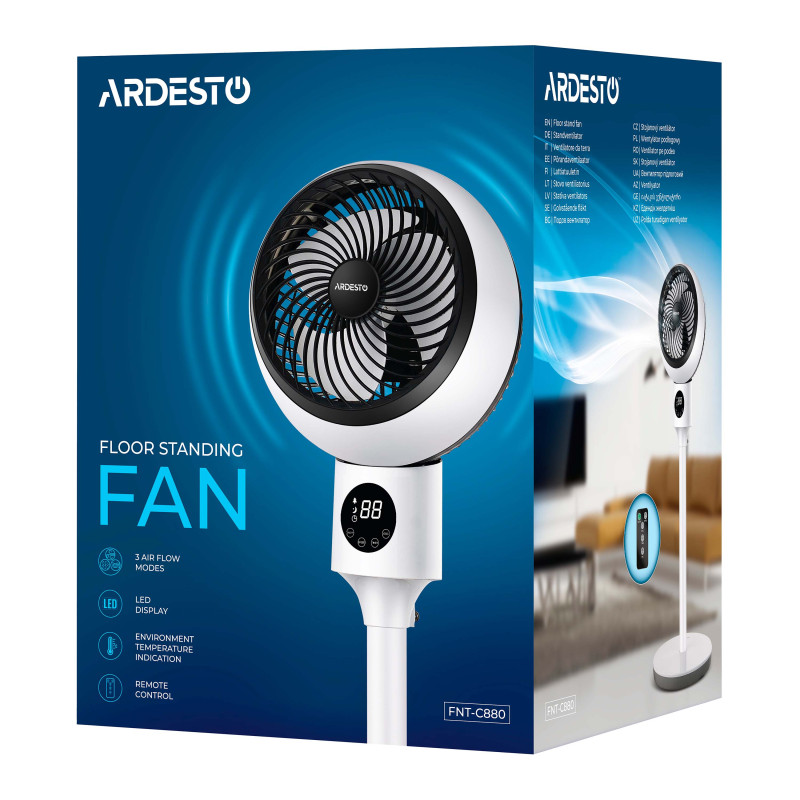 ARDESTO FNT-C880 – підлоговий вентилятор оригінального футуристичного дизайну. Лопаті сховано під чорною захисною кришкою, а основа нагадує збільшену підставку під мікрофон. Вентилятор має сенсорний LED-дисплей, а також пульт дистанційного керування. Виріб має три швидкості роботи обертання лопатей та три передвстановлених режими. Таймер на 15 годин та регульоване обертання в межах 90º роблять пристрій комфортним для використання під час літньої спеки.