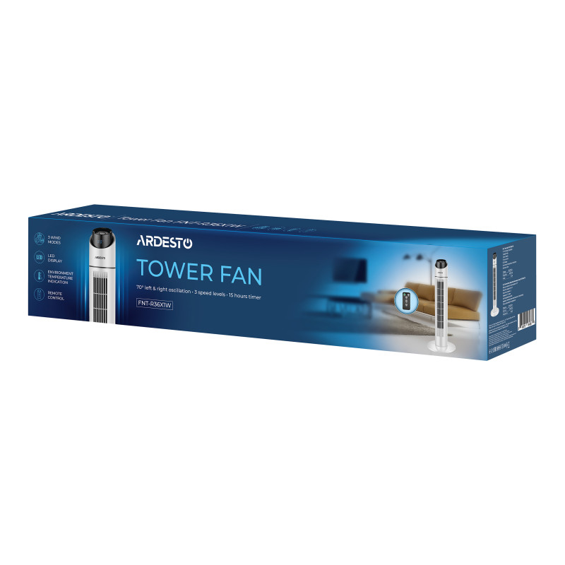 Підлоговий вентилятор колонного типу з потужністю 50 Вт, пультом дистанційного управління, таймером, датчиком температури та LED-дисплеєм. Вентилятор підтримує налаштування швидкості та обертання, а також три режими: морський бриз, свіжість лісу та класичне обдування.