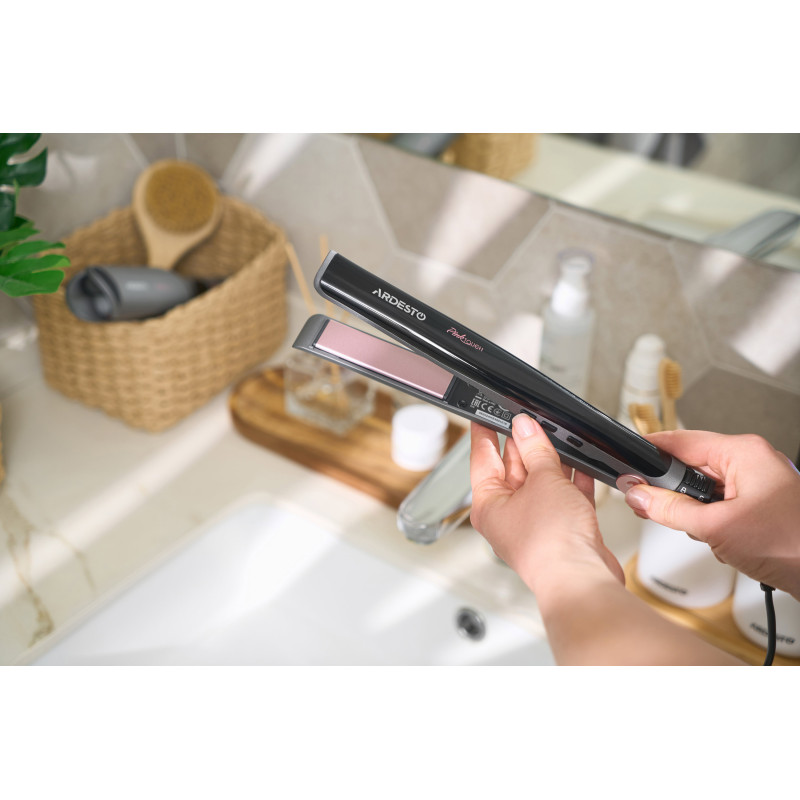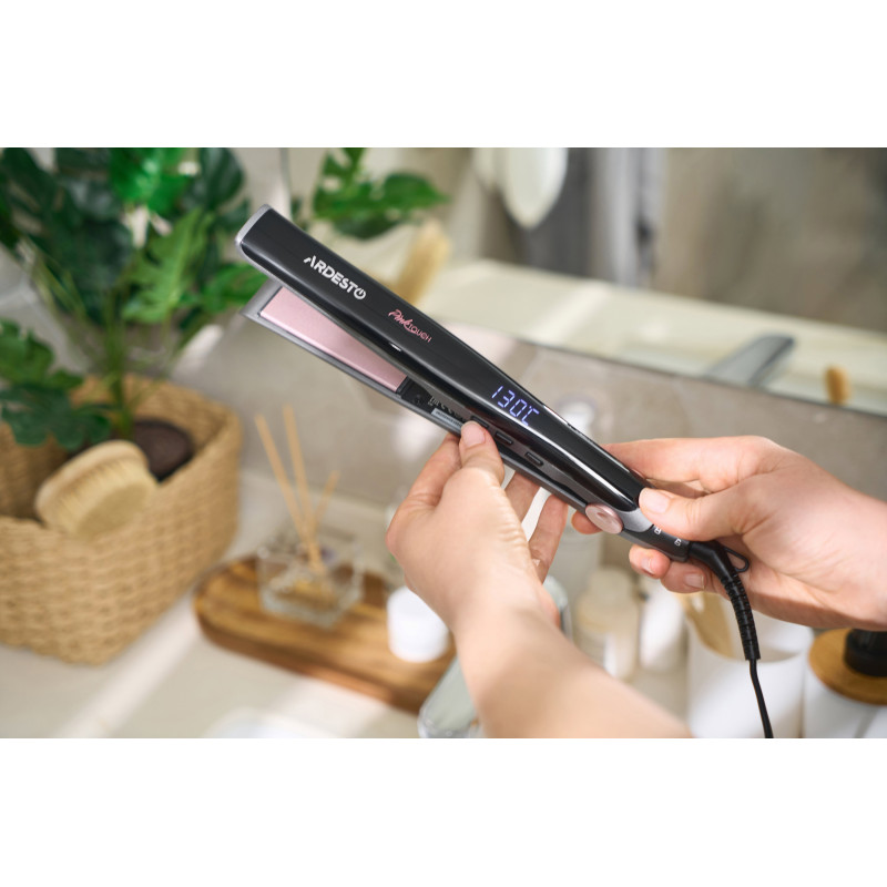 Випрямляч HS-R350PT – надійний помічник для догляду за волоссям. Завдяки цифровому LED-дисплею легко контролювати й налаштовувати температуру від 110 до 200 °C (крок 10 °C). Ба більше, модель досягає температури 200 °C лише за 3 хв, що робить процес укладання неймовірно швидким та ефективним. Функція автоматичного вимкнення через 60 хв, фіксація в закритому положенні й захист від перегрівання зумовлюють безпеку використання.