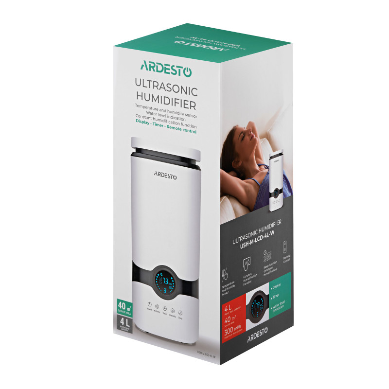 Ультразвуковий зволожувач повітря з LED-дисплеєм, пультом ДУ, автоматичним регулюванням інтенсивності випаровування, безшумною роботою, резервуаром на 4 літри, та ергономічною конструкцією з верхнім заливом води.