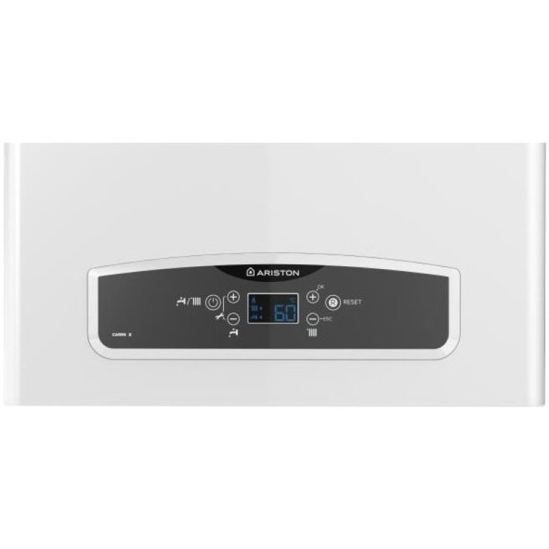 Котел газовий Ariston Cares X 24 CF EU, двоконтурний, димохідний, 24 кВт 3301315. Сучасний та ефективний апарат, що економно та розумно споживає газ та електроенергію. Є конвекційним або традиційним газовим котлом, має відкриту камеру згоряння. За технікою безпеки повинен бути підключений до димоходу, через який виводитимуться за межі приміщення продукти згоряння, що виробляються в процесі функціонування цього пристрою.