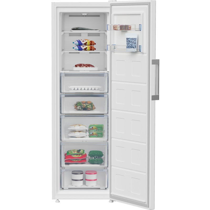 Морозильна камера Beko B1RFNE294W — вертикальне пристрій білого кольору з корисним об'ємом 260 л та класом енергоефективності E. Інверторний компрессор ProSmart забезпечує стабільну роботу, а технологія No Frost усуває потребу в ручному розморожуванні. Дверцята з можливістю перенавішування та сигналом відкритого положення полегшують доступ до вмісту. Чотири ящики із загартованого скла та лоток для льоду з кришкою дозволяють систематично зберігати продукти. Розміри 170,5×59,7×70,9 см роблять пристрій зручним для стандартних кухонь.