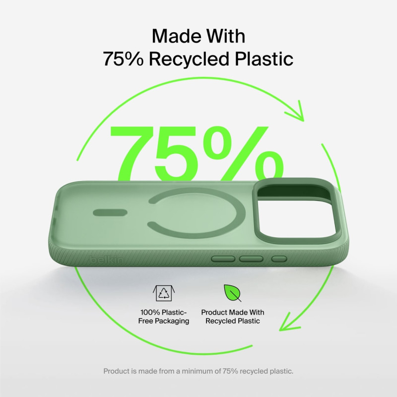 Belkin Grip для iPhone 17 Pro Max (MSA036HQSE, Sage) - класичний магнітний чохол у кольорі Sage (шавлія) з протиковзною текстурою, захистом від падінь до 2 м і повною сумісністю з MagSafe. Тонкий корпус із TPU (з перероблених матеріалів), вигнуті краї, поліровані кнопки та напівпрозоре покриття з м'яким фінішем. Стильний природний відтінок для тих, хто цінує елегантність та практичність.