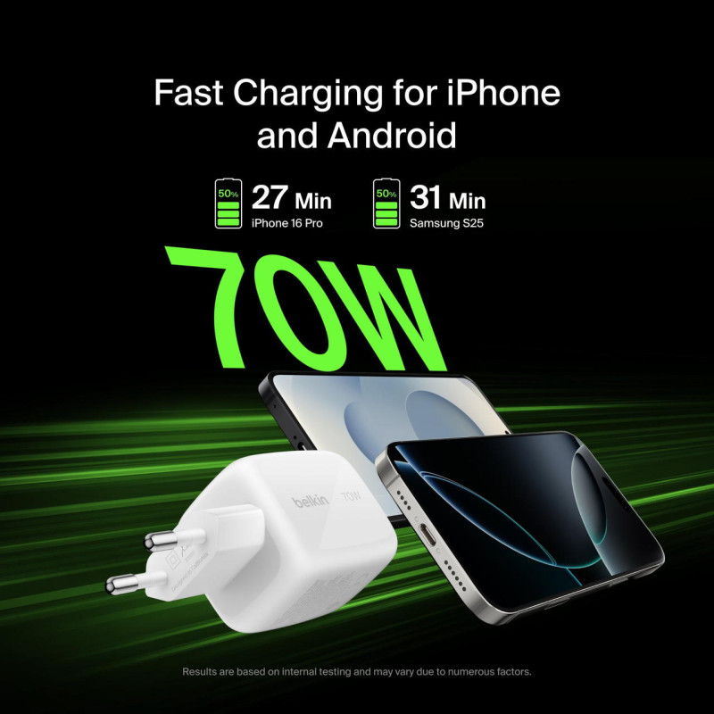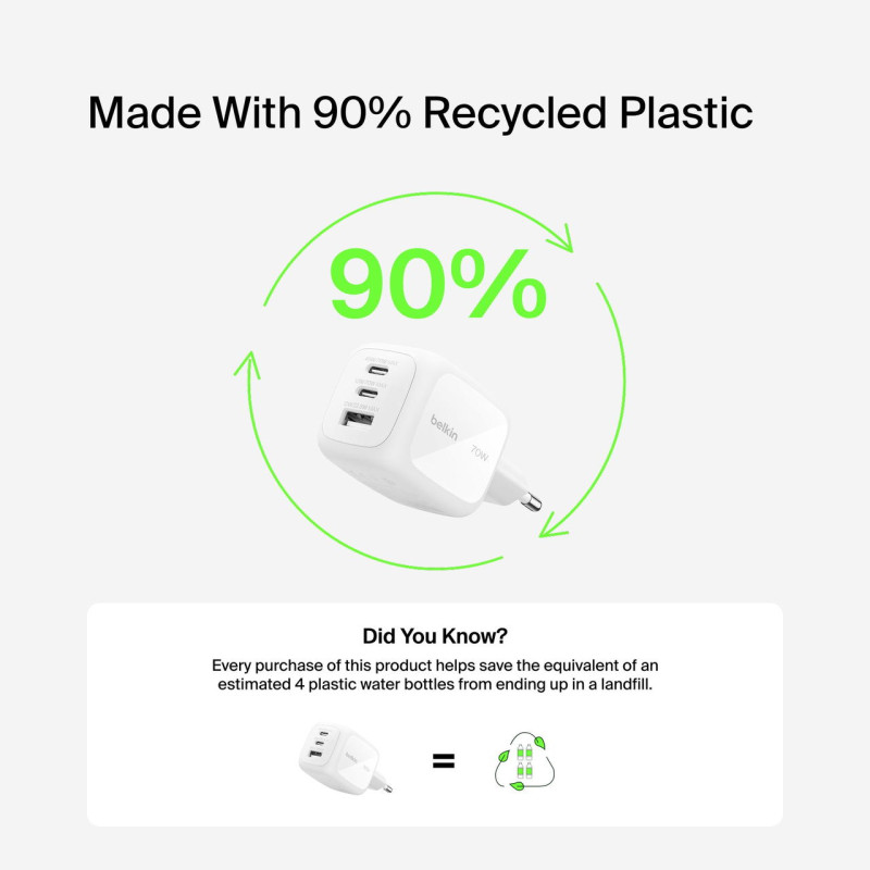Belkin 70Вт GaN зарядний пристрій забезпечує швидке та ефективне заряджання трьох пристроїв одночасно. Компактний корпус із складними контактами зручний для подорожей. Підтримка PD 3.1 та PPS дозволяє оптимізувати потужність для смартфонів, планшетів, ноутбуків та аксесуарів. Надійні системи захисту забезпечують безпечне використання. Екологічні матеріали корпусу та пакування зменшують вплив на довкілля.
