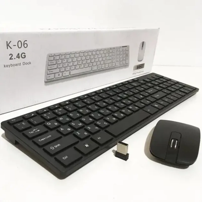 Клавіатура та миша UKC K06 "Бездротовий комплект" - гарне придбання для тих, хто хоче освіжити свої комп'ютерні аксесуари та не витрачає багато часу на окремий вибір клавіатури та миші. Головною перевагою такого набору є те, що працюють пристрої без проводового підключення, а по радіоканалу блютуз, що дуже зручно і практично, тому що ви вже не прив'язуєтеся у своїх діях до обмежених розмірів проводів. Клавіатура невеликих розмірів, тонка, легка та компактна з необхідним набором стандартних кнопок функціоналу та працює від двох міні-пальчикових батарейок. Також до клавіатури у комплекті постачається силіконовий чохол, який захистить від випадкового пролиття рідини чи інших забруднень.