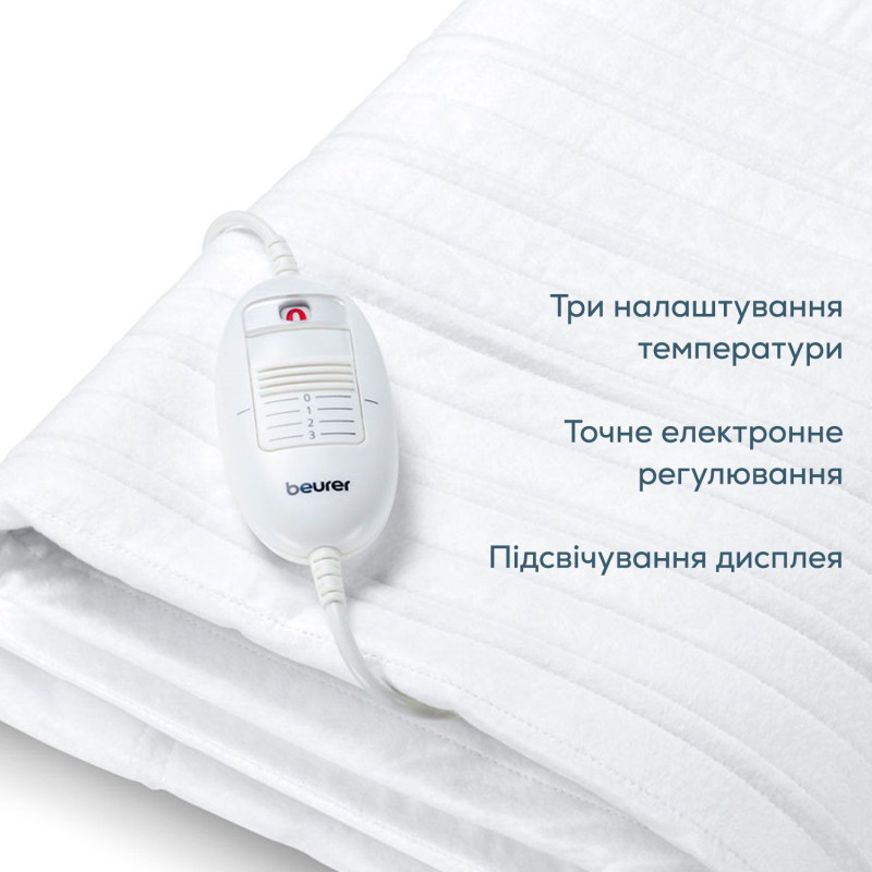 Електропростирадло Beurer TS 17 — односпальне простирадло з підігрівом, що створює приємне тепло під час сну та забезпечує комфорт навіть у прохолодну пору року. М'яка флісова поверхня приємна на ощупь і зберігає тепло, а еластичні ремінці надійно фіксують простирадло на матраці. Пристрій має три температурні режими, систему безпеки Beurer (BSS) та можливість машинної стирки при 30 °C. Потужність 60 Вт забезпечує економне енергоспоживання.