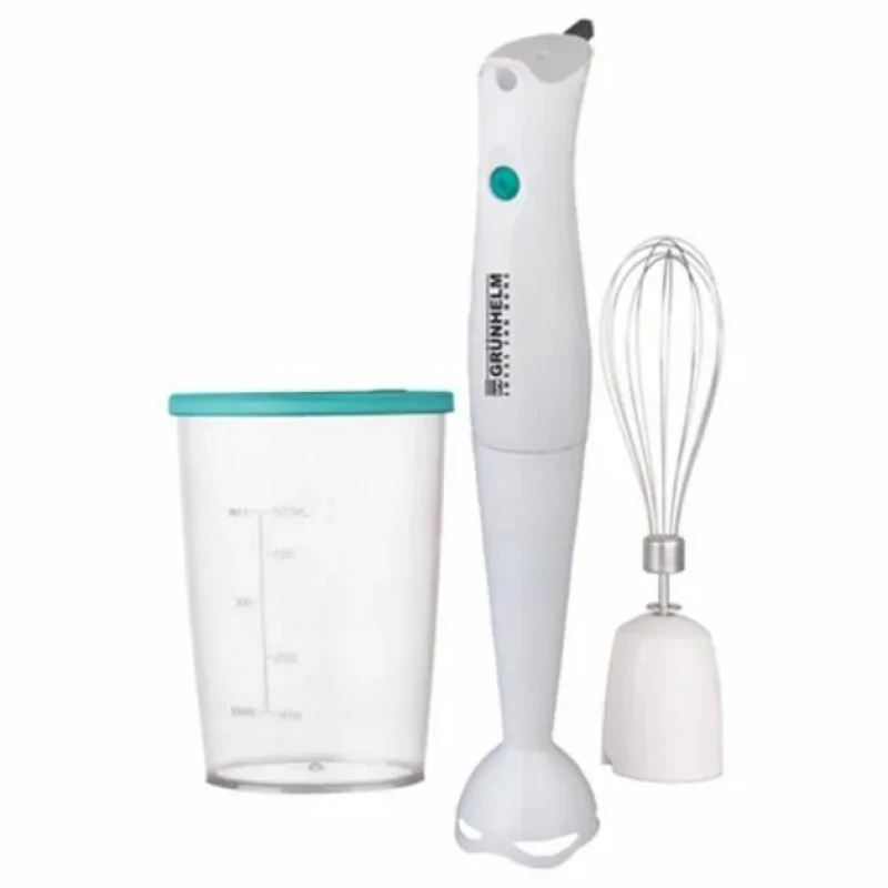 Потужність, Вт 300 Ємність міні-подрібнювача Без подрібнювача Ємність склянки, мл 600 Вага в упаковці, кг 0.85 Габарити (ВхШхГ), см 230 x 190 x 130 Довжина кабелю, м 1 Кількість швидкостей 1 Колір виробу Білий Комплектація Блендер, Вінчик, Мірний стакан, Інструкція Країна-виробник товару Китай Матеріал ніжки блендера Пластик Подрібнювач Без подрібнювача Блендер Grunhelm EBS-300P — це простий, але ефективний помічник на вашій кухні, який дозволить швидко приготувати різноманітні страви. З потужністю 300 Вт він ідеально підходить для приготування пюре, соусів або збивання коктейлів. Його пластикові ніжка та мірний стакан об'ємом 600 мл роблять його легким у використанні та зручним у зберіганні. Цей блендер оснащений одним швидкісним режимом, що дозволяє без зайвих зусиль працювати з різними інгредієнтами. Завдяки компактним розмірам (230 x 190 x 130 мм) і вазі 0.85 кг, він займає мінімум місця на кухні, а довжина кабелю 1 м забезпечує зручність у використанні. Блендер Grunhelm EBS-300P — це оптимальне рішення для тих, хто цінує простоту та ефективність на кухні. Придбати блендер Grunhelm EBS-300P можна для приготування дитячого харчування, змішування інгредієнтів для пюре або коктейлів. Легкість і простота в експлуатації роблять цей блендер чудовим варіантом для будь-якої кухні.