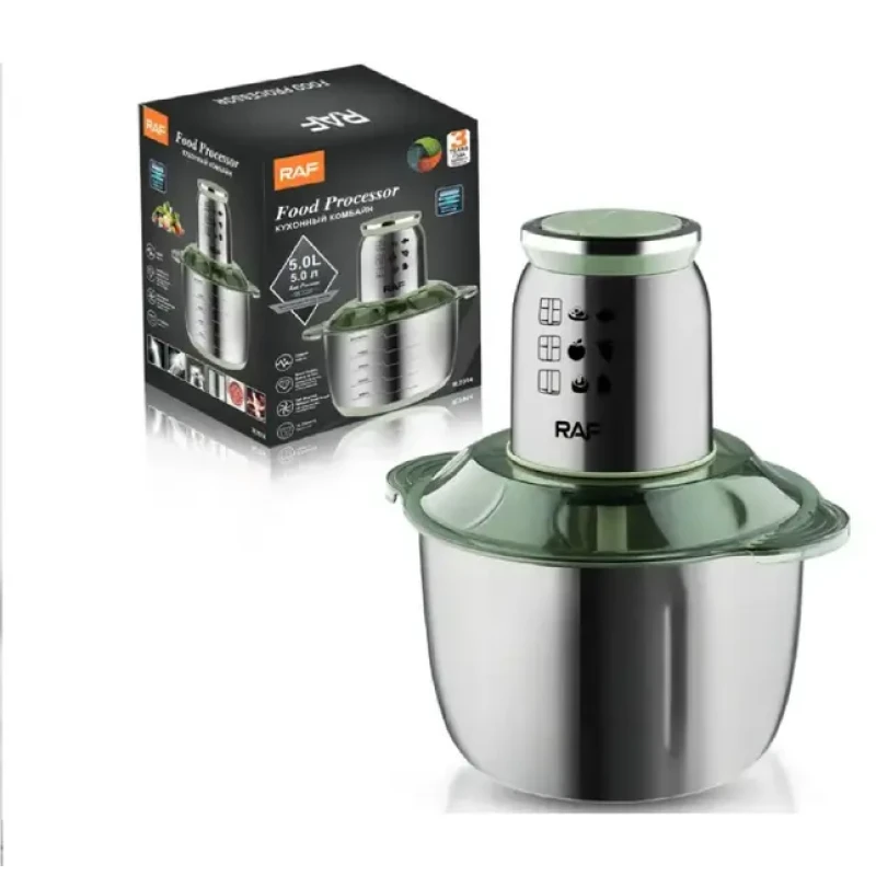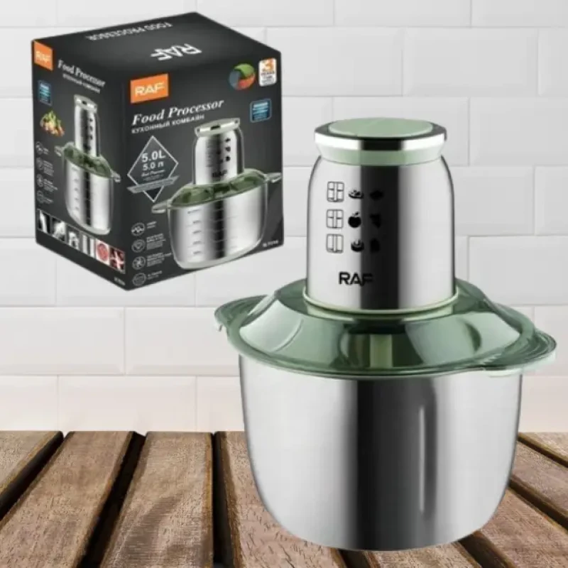 Кухонний блендер подрібнювач RAF R.7014 – це портативний та багатофункціональний подрібнювач, блендер, м'ясорубка. Це невеликий, але дуже корисний пристрій буквально працює за вас: просто засипте інгредієнти в чашу, натисніть кнопку, і він зробить все сам. Для великої нарізки достатньо кількох швидких натискань. Якщо потрібно подрібнити інгредієнти, утримуйте кілька секунд. Прилад такий потужний, що може розмолоти продукти у пюре! Секрет ефективної та швидкої роботи подрібнювача полягає у подвійному ножі з якісної нержавіючої сталі та потужному моторі. Містка чаша об'ємом 5 літра дозволяє готувати велику кількість продуктів.
