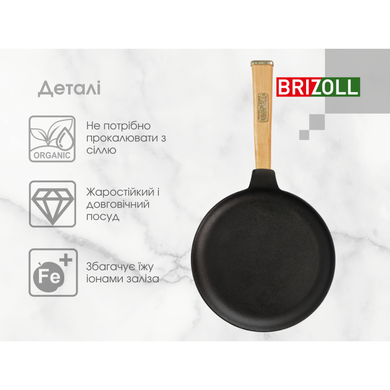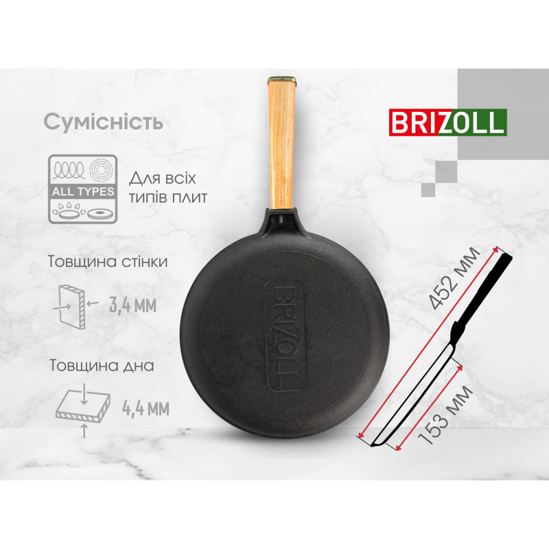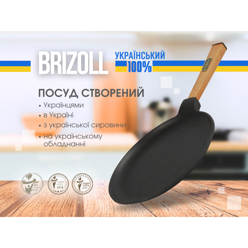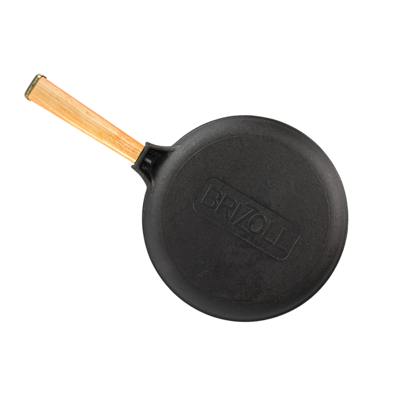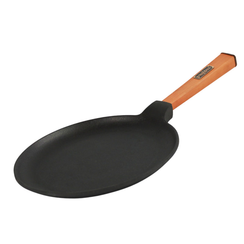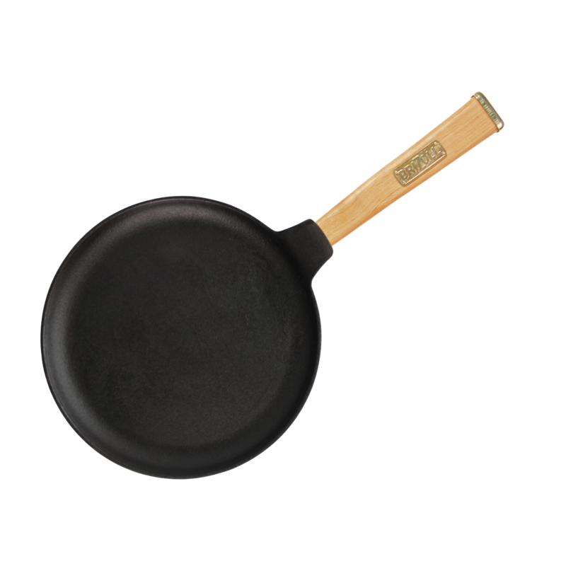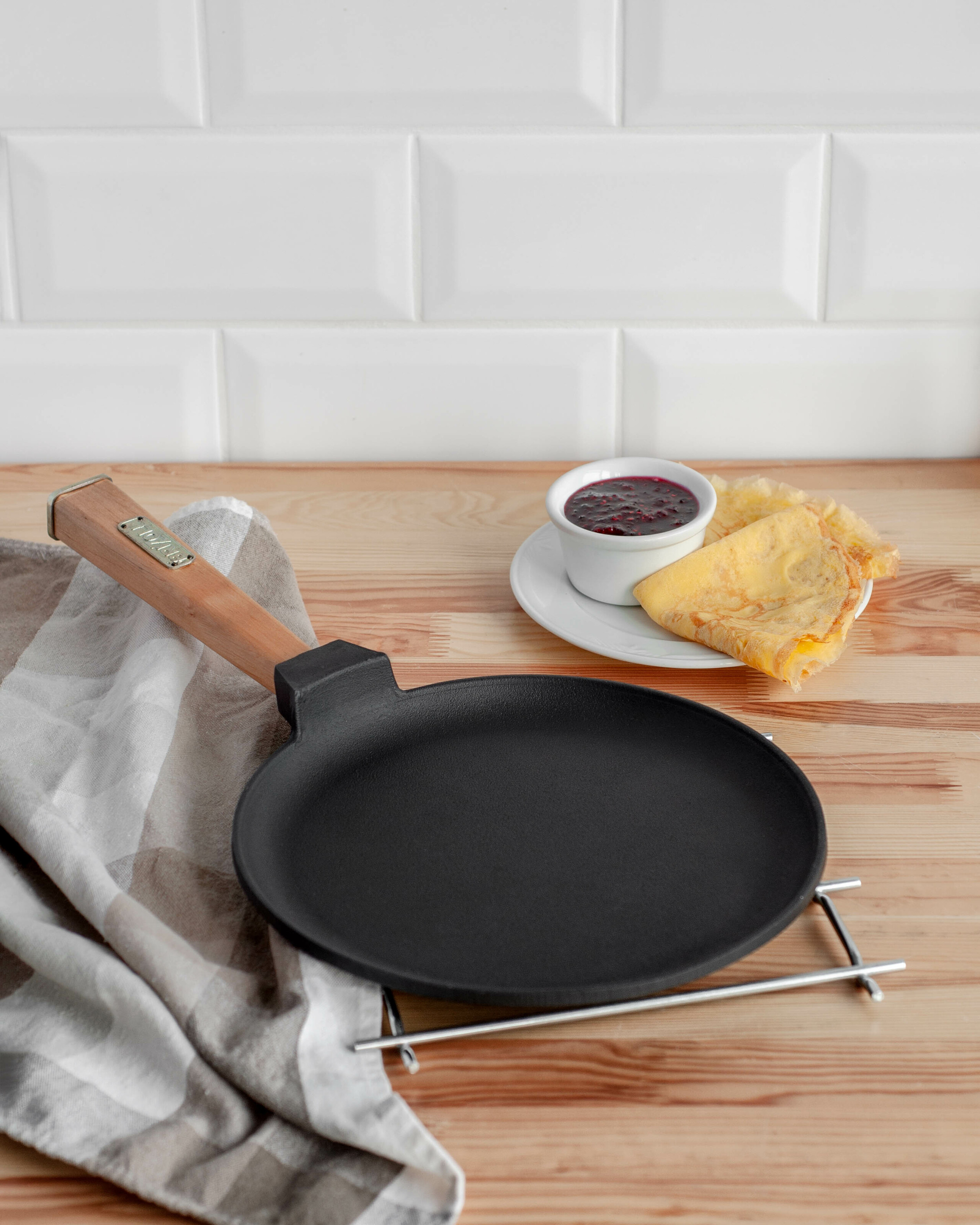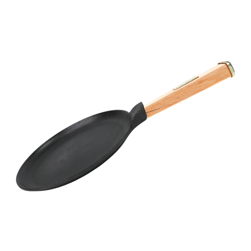 Сковорода для млинців виготовлена з литого чавуну, ручка виконана з вільхи, має ергономічну форму і зручно лежить у руці.