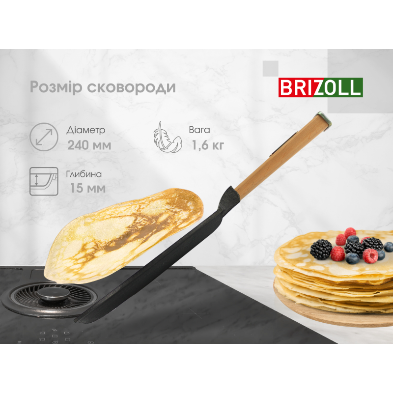 В асортименті сковорода представлена в діаметрі 220 і 240 мм. Низький бортик 15 мм, забезпечує зручність у приготуванні млинців, оладок, грінок тощо.