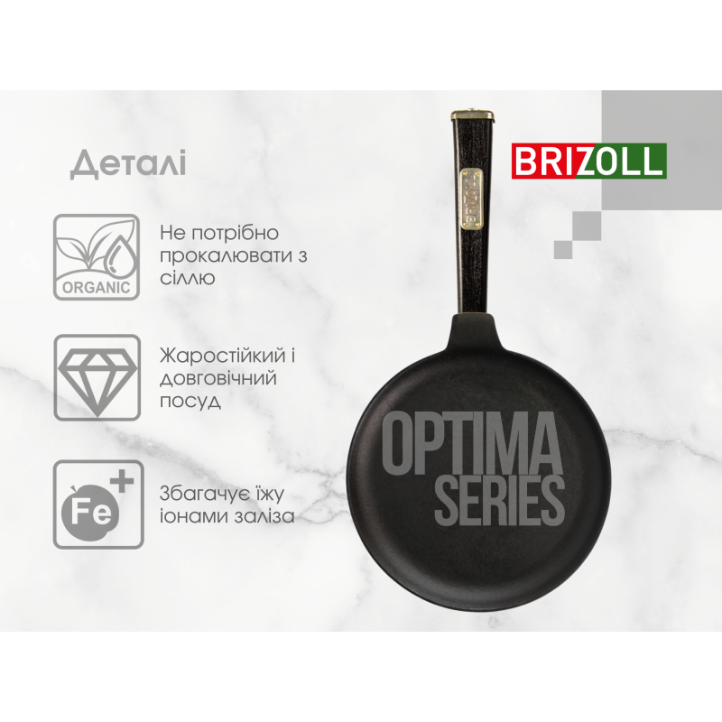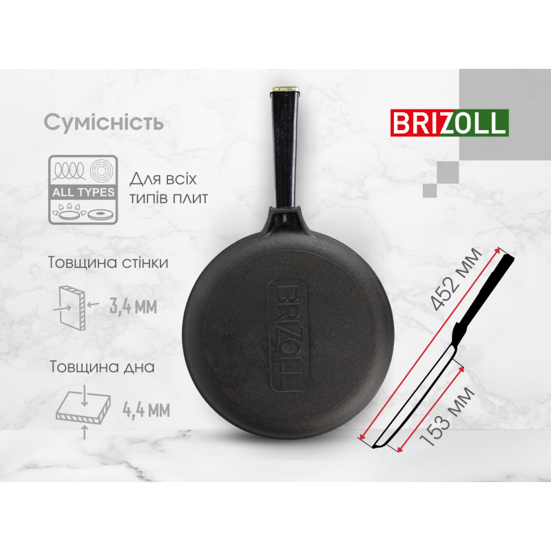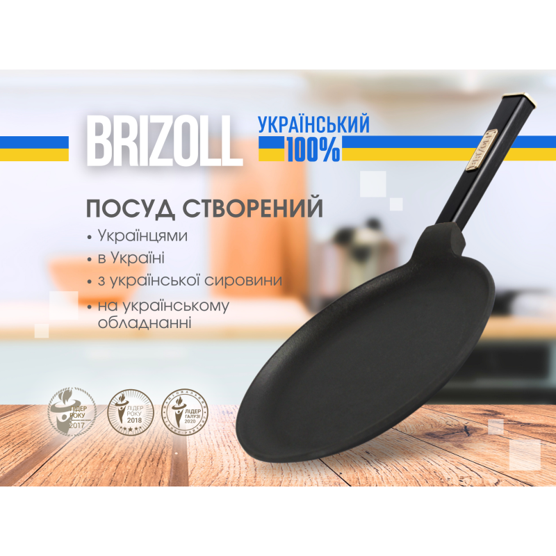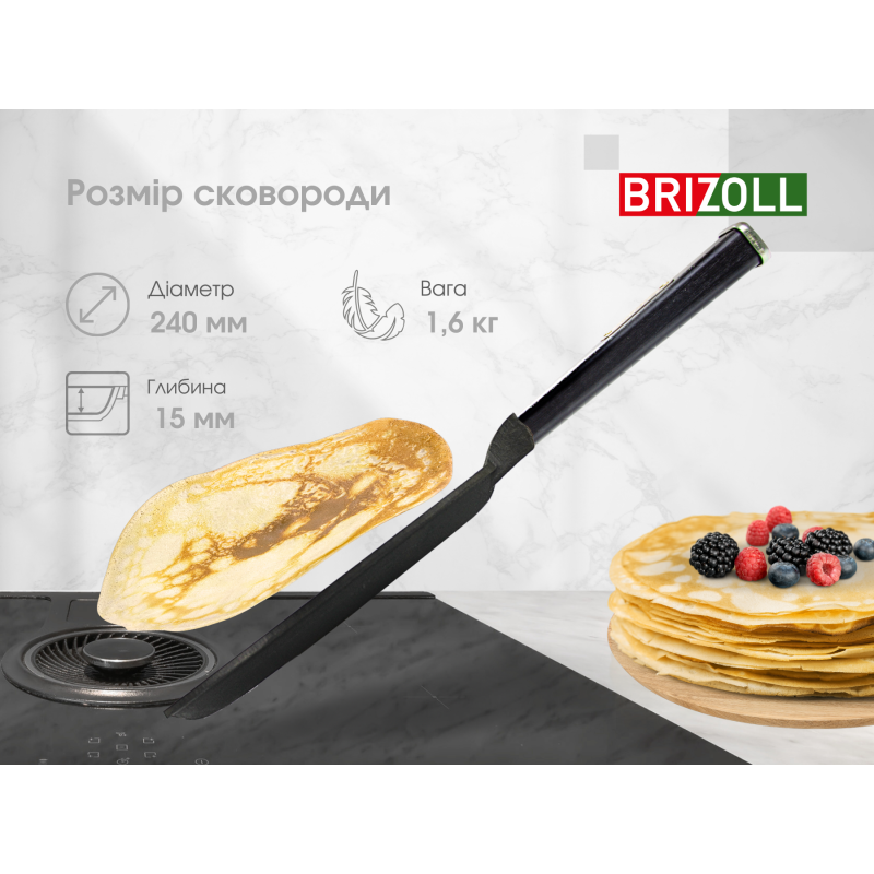 В асортименті сковорода представлена в діаметрі 220 і 240 мм. Низький бортик 15 мм, забезпечує зручність у приготуванні млинців, оладок, грінок тощо.