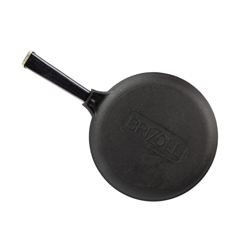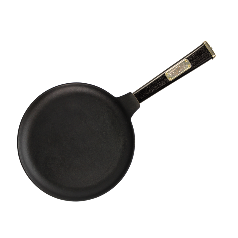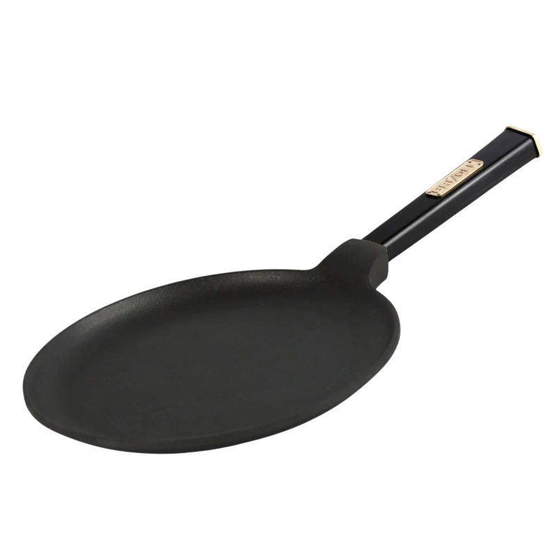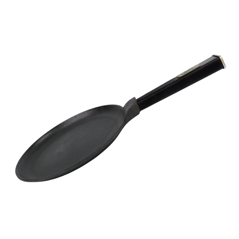 Сковорода для млинців виготовлена з литого чавуну, ручка виконана з вільхи, має ергономічну форму і зручно лежить у руці.