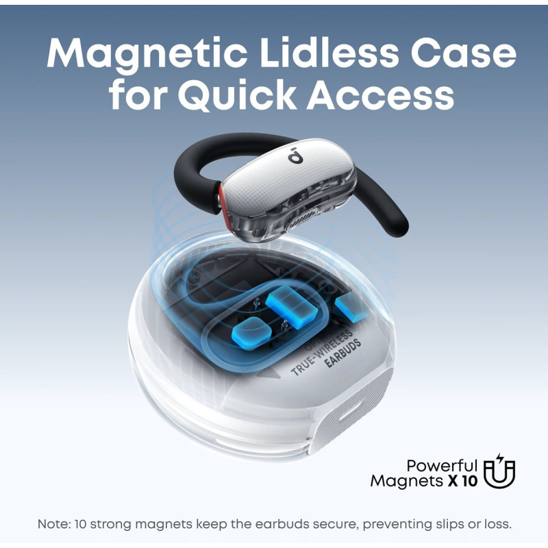 Гарнітура вирізняється інноваційним відкритим дизайном, який не закриває вушний канал, забезпечуючи комфорт без тиску та дозволяючи чути навколишні звуки. Завдяки 4-рівневим регульованим вушним гачкам, SoundCore V40i адаптується до будь-якої форми вуха, забезпечуючи надійну фіксацію навіть під час інтенсивних рухів. Ця конструкція не лише підвищує комфорт, але й наближає динаміки до вушного каналу, забезпечуючи глибший бас із приростом до 7.5 дБ порівняно з нерегульованими гачками, що робить звук насиченим і потужним.