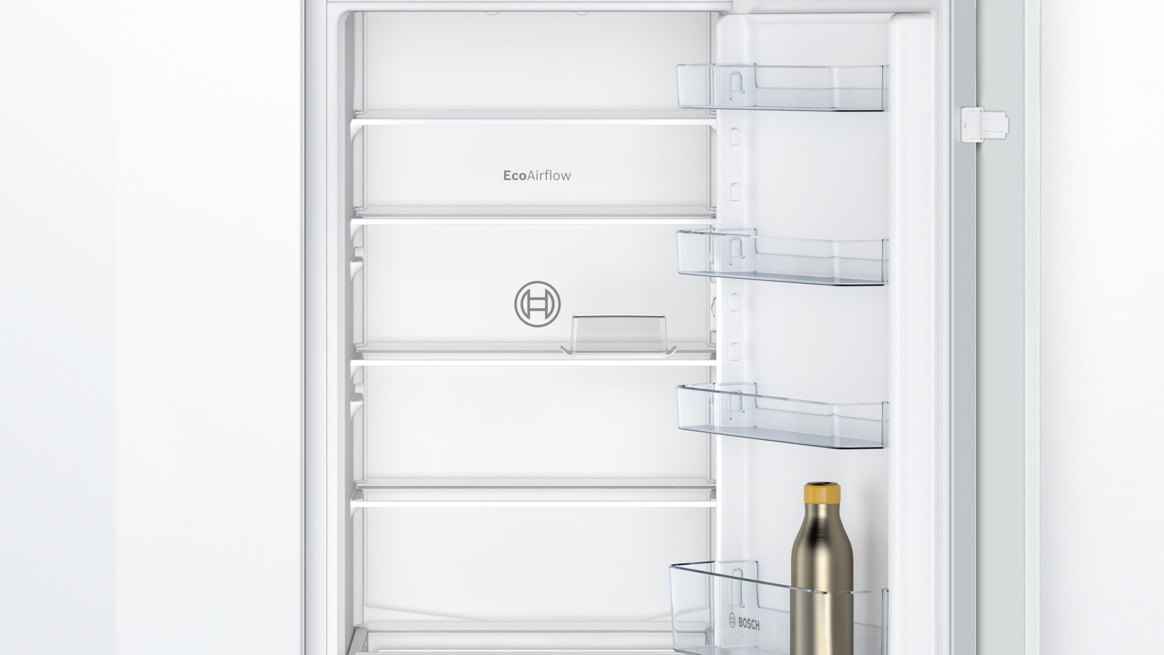 KIV87NSF0 Serie|2, Вбудований холодильник з нижньою морозильною камерою. Яскраве освітлення холодильної камери. Комфорт та безпека у користуванні. Електронне регулювання температури зі світлодіодною індикацією. Функція швидкого заморожування SuperFreezing з автоматичним відключенням.