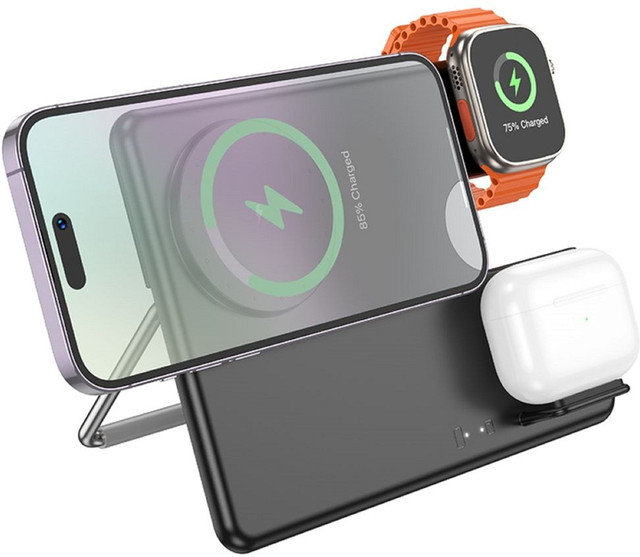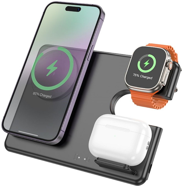 - Унікальна бездротова зарядна станція Hoco CQ1 пропонує неперевершену зручність, дозволяючи одночасно заряджати до трьох пристроїв: iPhone, Apple Watch та AirPods.