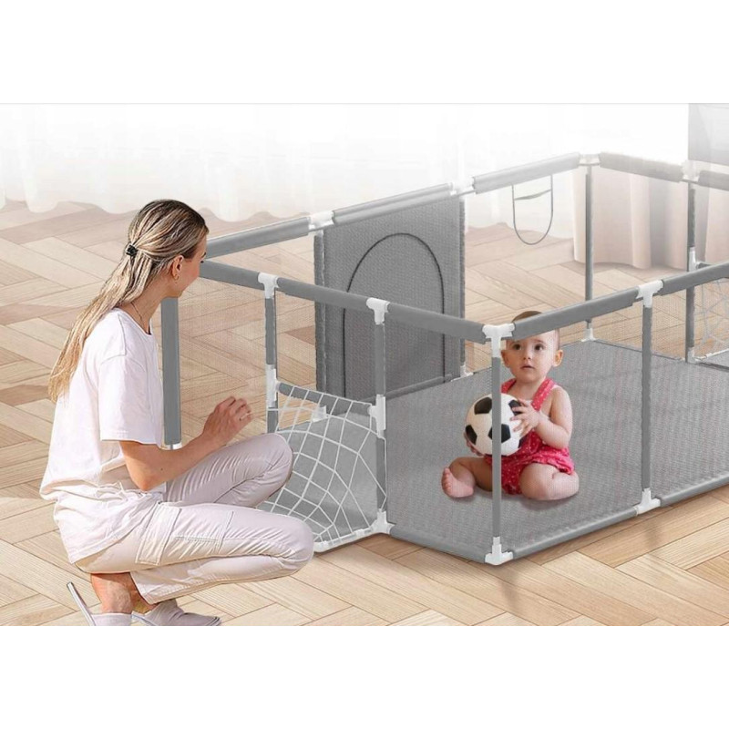 Активні ігри та розвиток навичок: Манеж оснащений двома футбольними воротами, баскетбольним кільцем та висувними воротами, що забезпечує масу можливостей для активної гри та розвитку спортивних навичок вашої дитини.