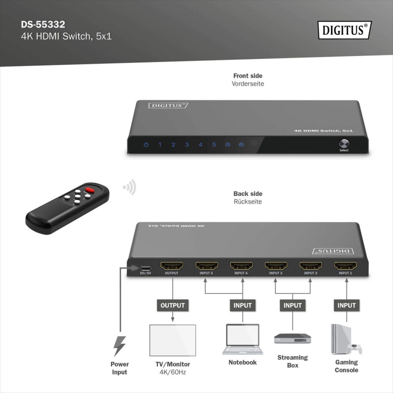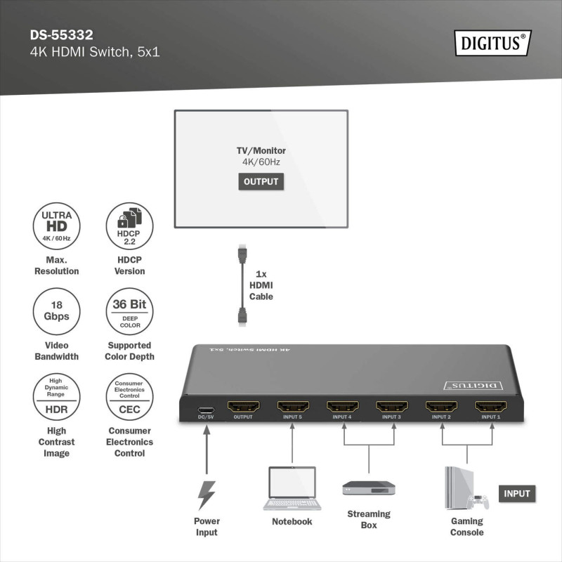 Відеокомутатор DIGITUS UHD HDMI 5x1 дозволяє підключити п’ять джерел сигналу до одного дисплея через HDMI. Перемикання між пристроями відбувається за допомогою дистанційного керування, на самому пристрої або автоматично. Підтримує роздільну здатність 4K/60 Гц, HDR та HDCP 2.2 для високої якості відео. Живлення здійснюється через Micro USB, що робить установку простою та зручною. Ідеальний для домашніх кінотеатрів, конференц-залів і настінного монтажу телевізора.