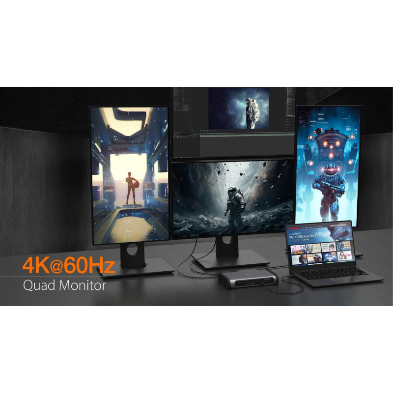 Ця док-станція Thunderbolt 4 Quad Display перетворює ваш ноутбук Windows або Mac на повноцінну робочу станцію з підтримкою до чотирьох дисплеїв з роздільною здатністю 4K 60Hz, трьох дисплеїв з роздільною здатністю 4K 60Hz або двох дисплеїв з роздільною здатністю 5K 60Hz або 8K 60Hz на одному дисплеї.