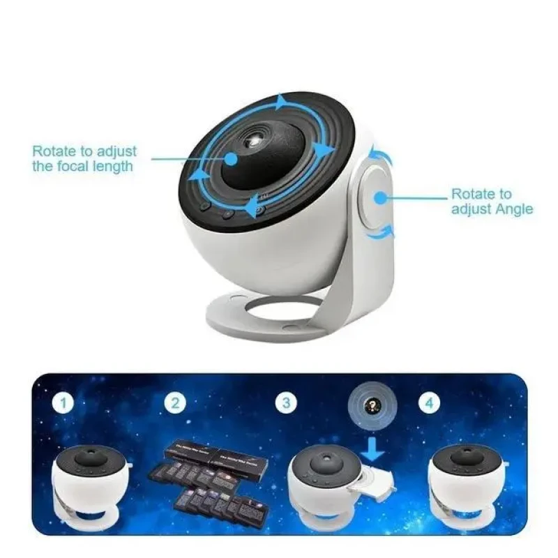 Проектор зоряного неба є компактним домашнім мініпланетарієм, ідеальним для використання в спальні, вітальні або дитячій кімнаті. Цей безшумний і невеликий проектор не просто нічник, але також служить прекрасним помічником для створення затишку і спокійної атмосфери перед сном. Його особливості містять проекції галактики Андромеди, Чумацького Шляху, планет нашої сонячної системи та інших дивовижних зображень. До проектора додаються 12 змінних картриджів, а також картридж у формі космонавта на ракеті з функцією нічного підсвічування.