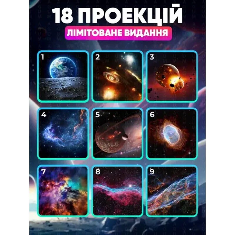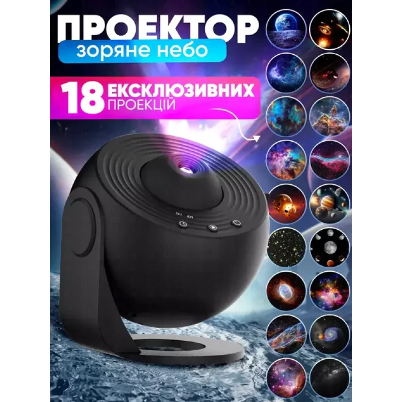 Проектор зоряного неба є компактним домашнім мініпланетарієм, ідеальним для використання в спальні, вітальні або дитячій кімнаті. Цей безшумний і невеликий проектор не просто нічник, але також служить прекрасним помічником для створення затишку і спокійної атмосфери перед сном. Його особливості містять проекції галактики Андромеди, Чумацького Шляху, планет нашої сонячної системи та інших дивовижних зображень. До проектора додаються 18 змінних картриджів, а також картридж у формі космонавта на ракеті з функцією нічного підсвічування.