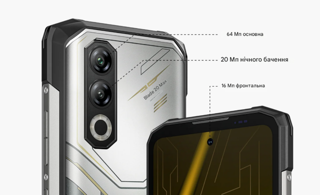 Blade20 Max оснащений потужною 64-мегапіксельною основною камерою — значним оновленням порівняно з попередніми моделями. Вона фіксує приголомшливі деталі денного світла з реалістичною чіткістю. Коли темніє, вмикається 20-мегапіксельна камера нічного бачення, яка робить чіткі зображення навіть у майже непроглядній темряві. Від гірських вершин до слабо освітлених працівників, ця подвійна камера забезпечує професійні результати в будь-якому середовищі.